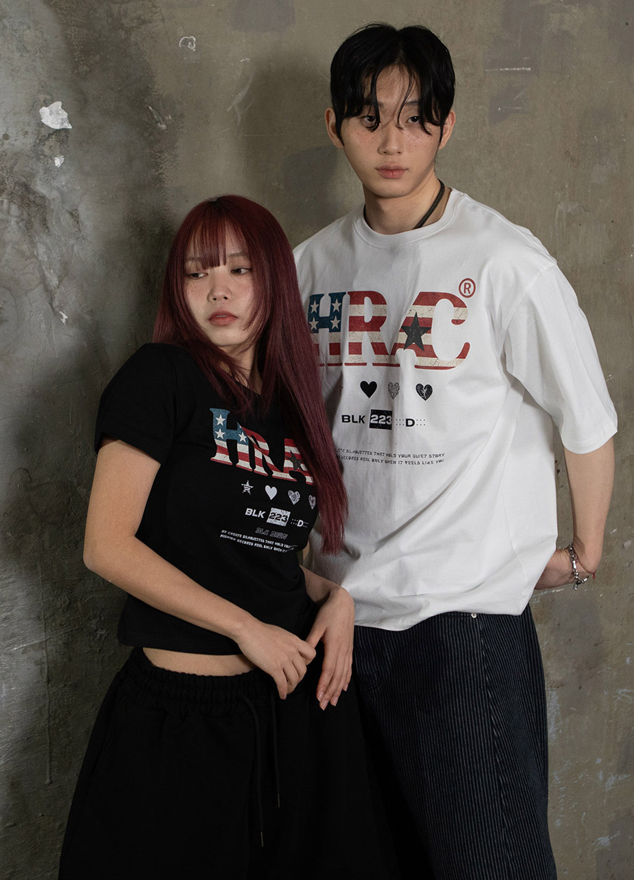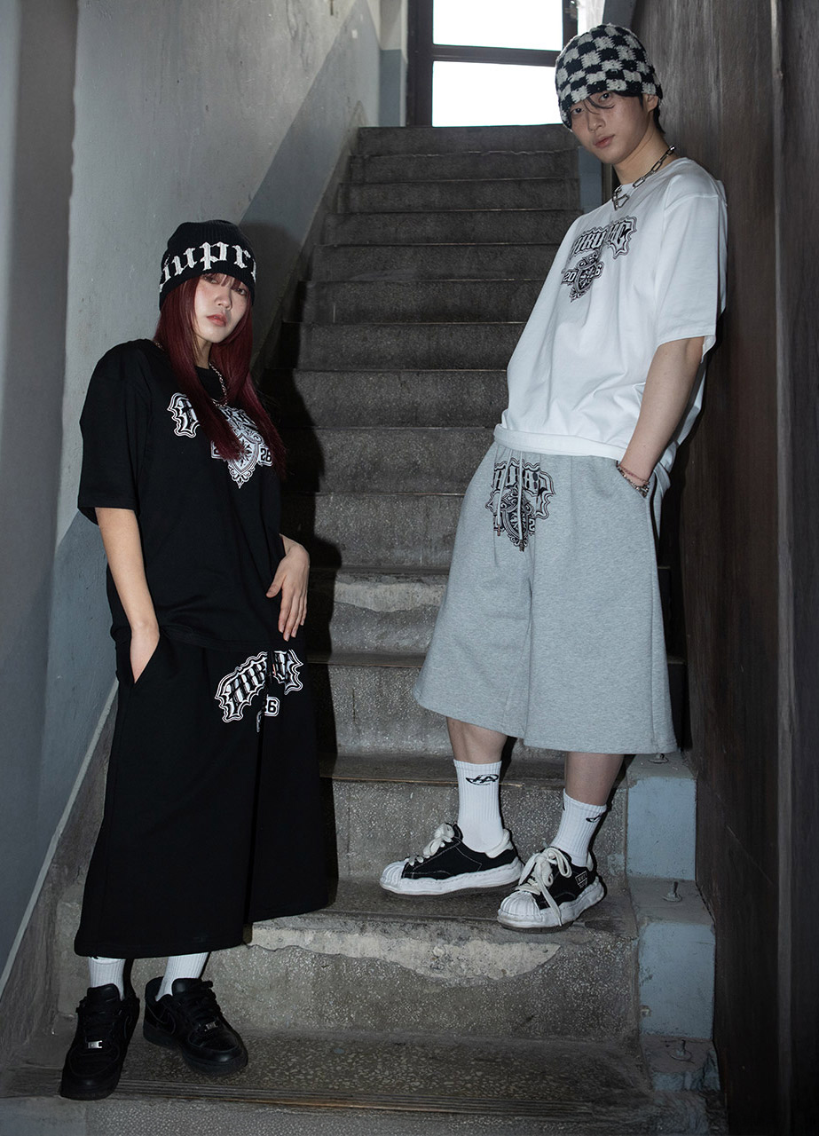 거친 텍스처의 그래픽 배치와 오버사이즈 실루엣이 조화를 이루며,