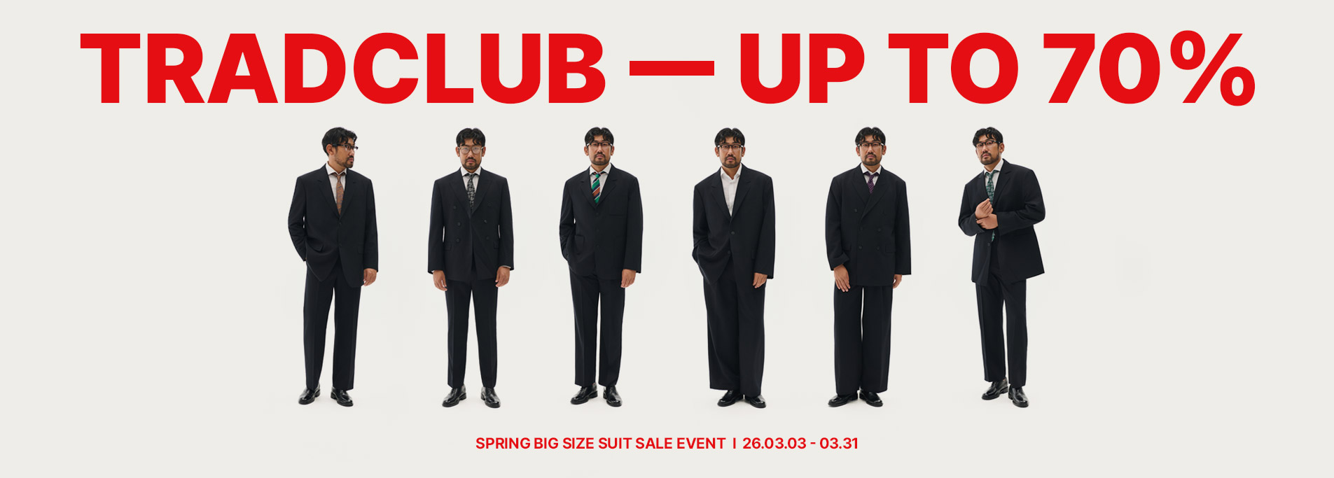 트래드 클럽 봄맞이 기간 한정 파격 이벤트! 빅 사이즈 정장이 10만 원? 딱 한 달만 이 가격. 다시는 올 수 없는 가격.