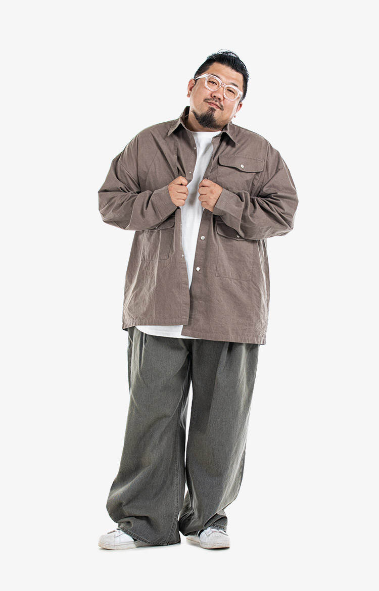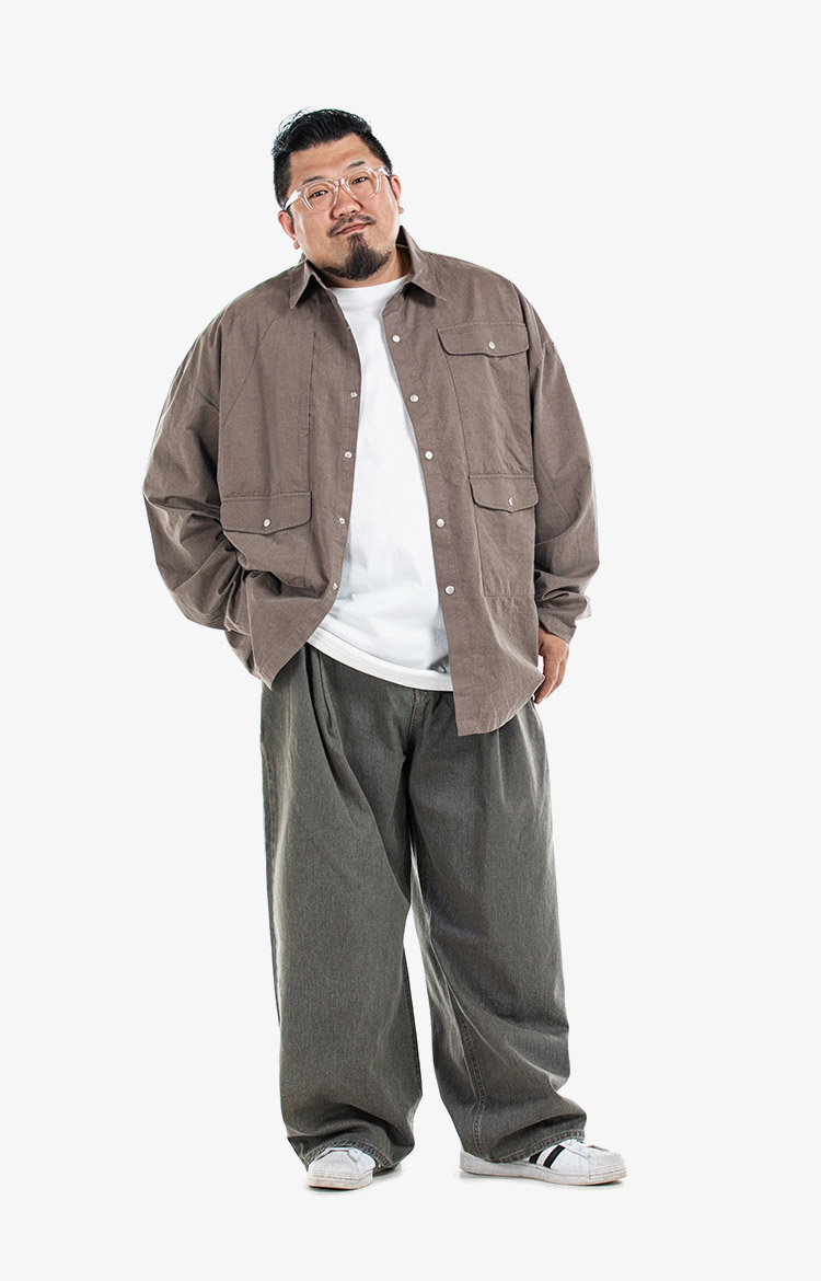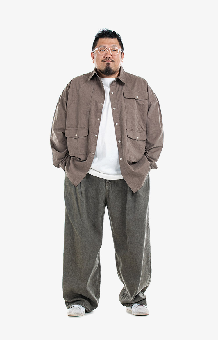 트러커 자켓과 와이드 슬랙스를 매치한 스타일링