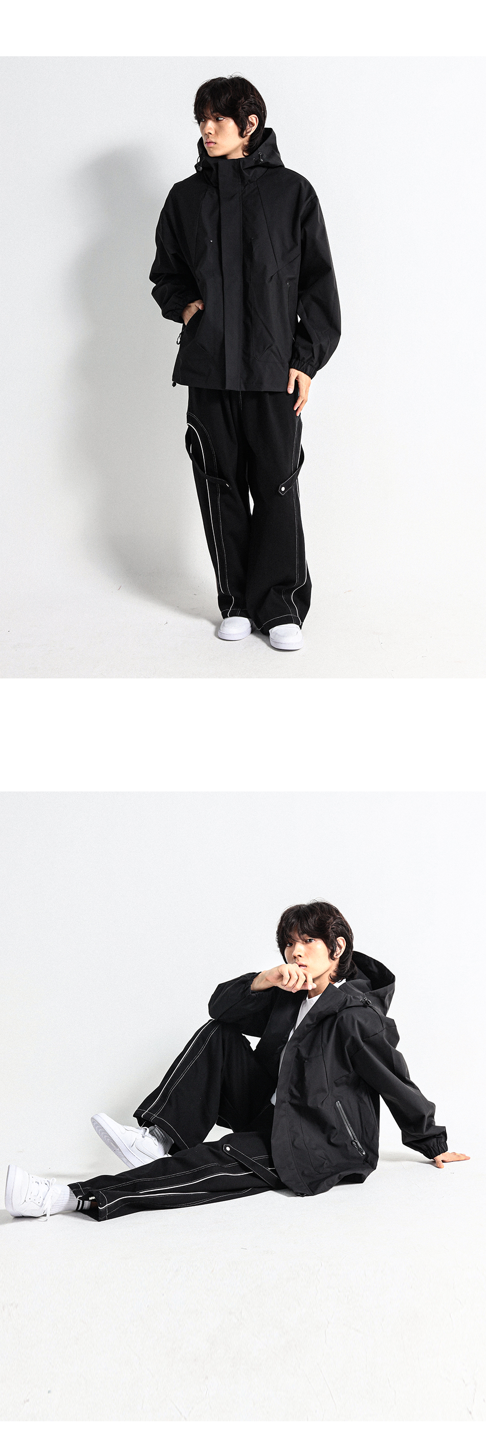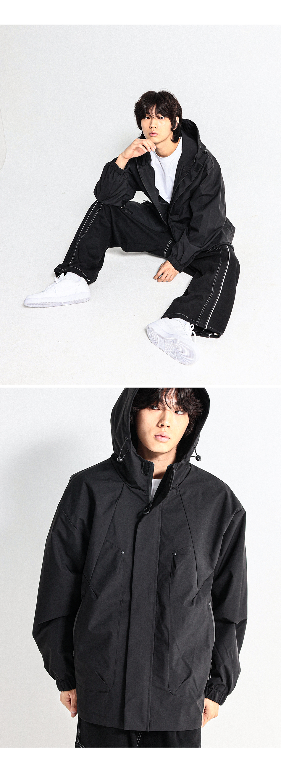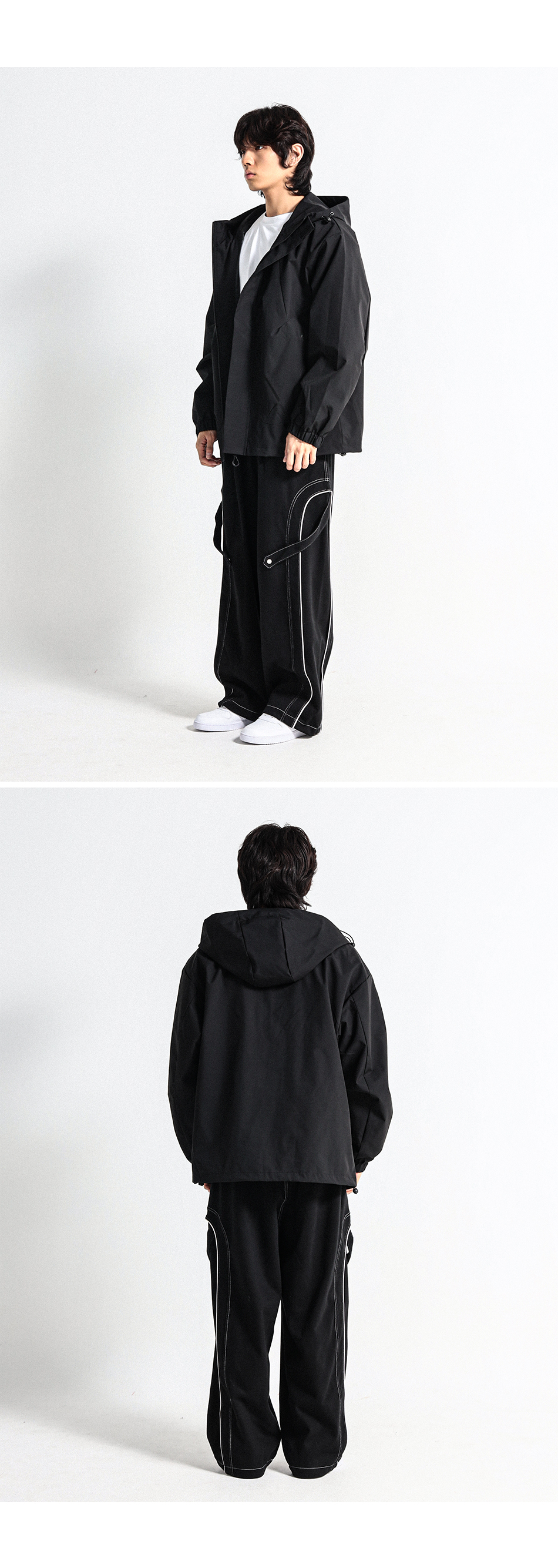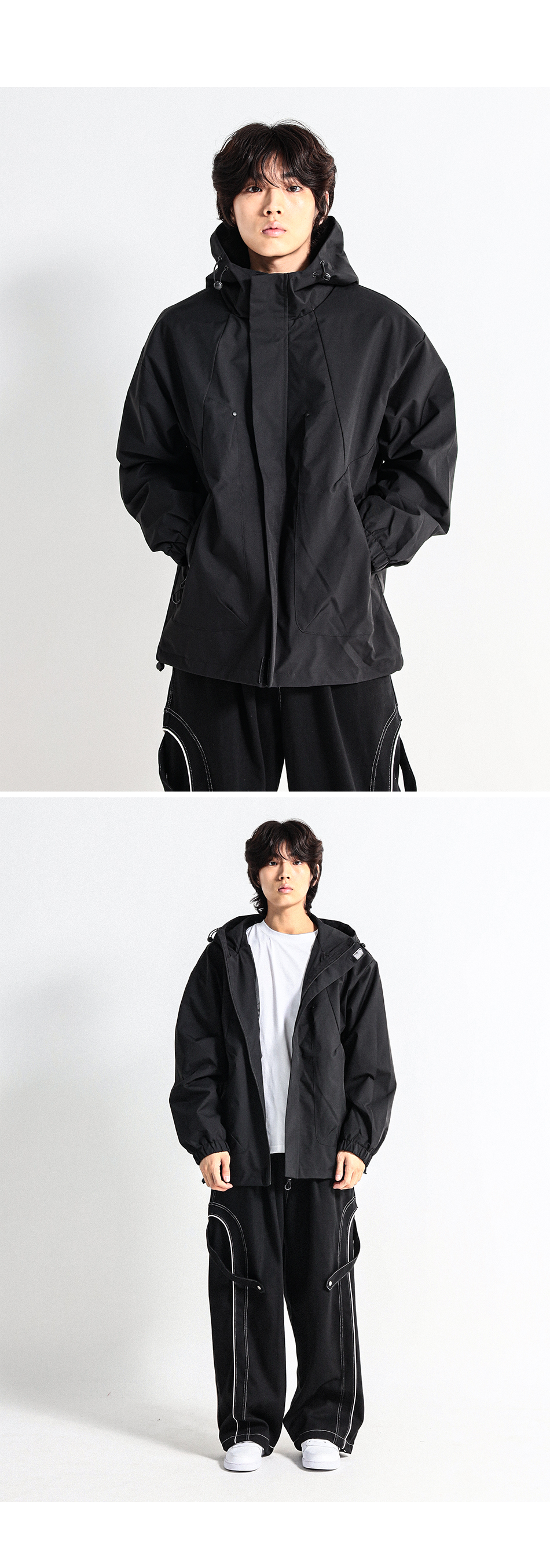 사선절개의 디자인을 넣어서 보다 활동성이 편하며 생활방수 기능까지 더해진 후드바람막이점퍼