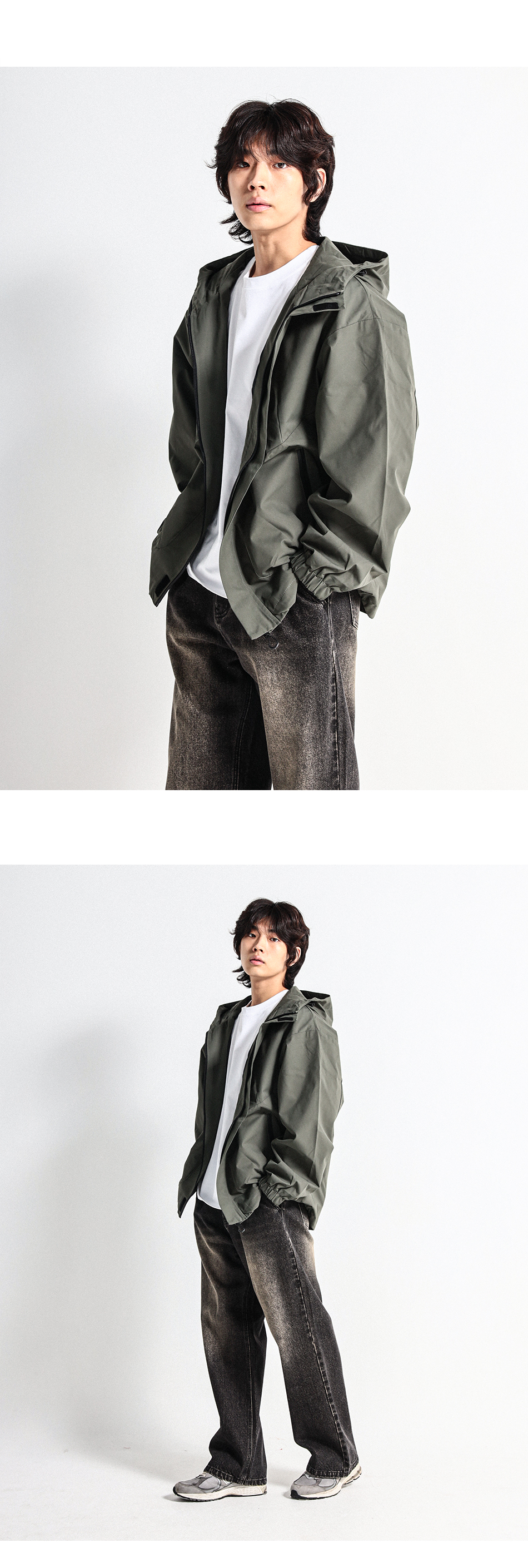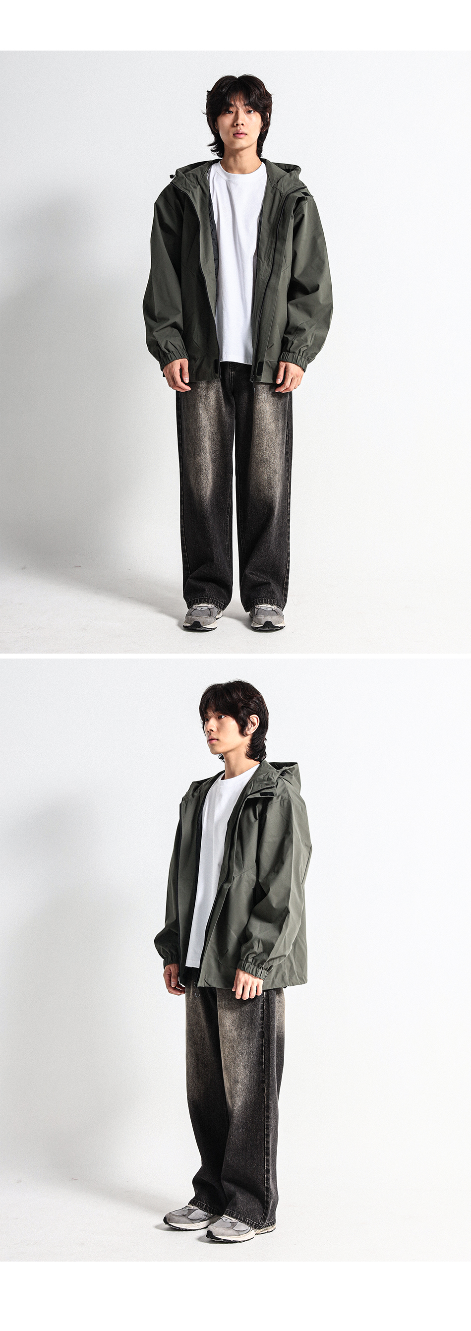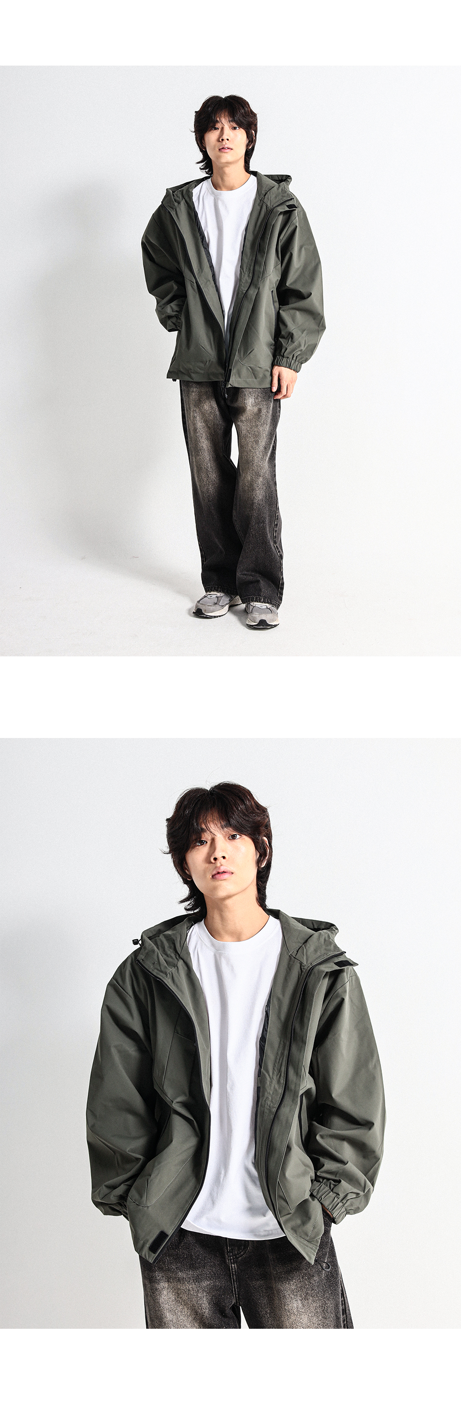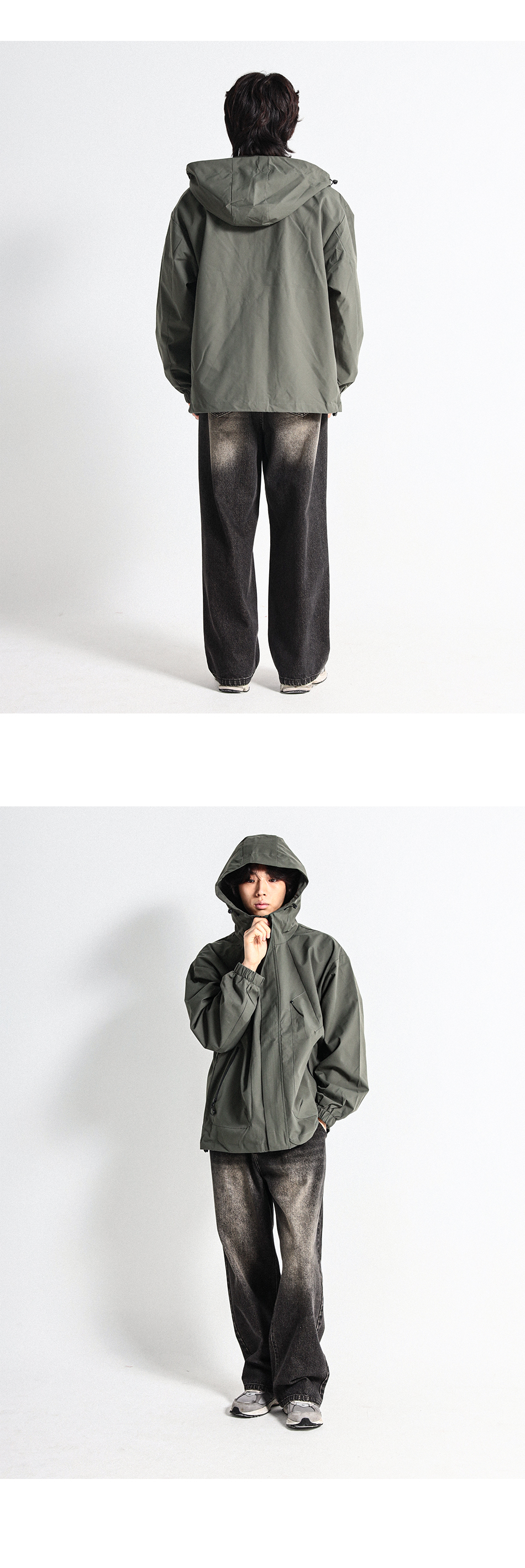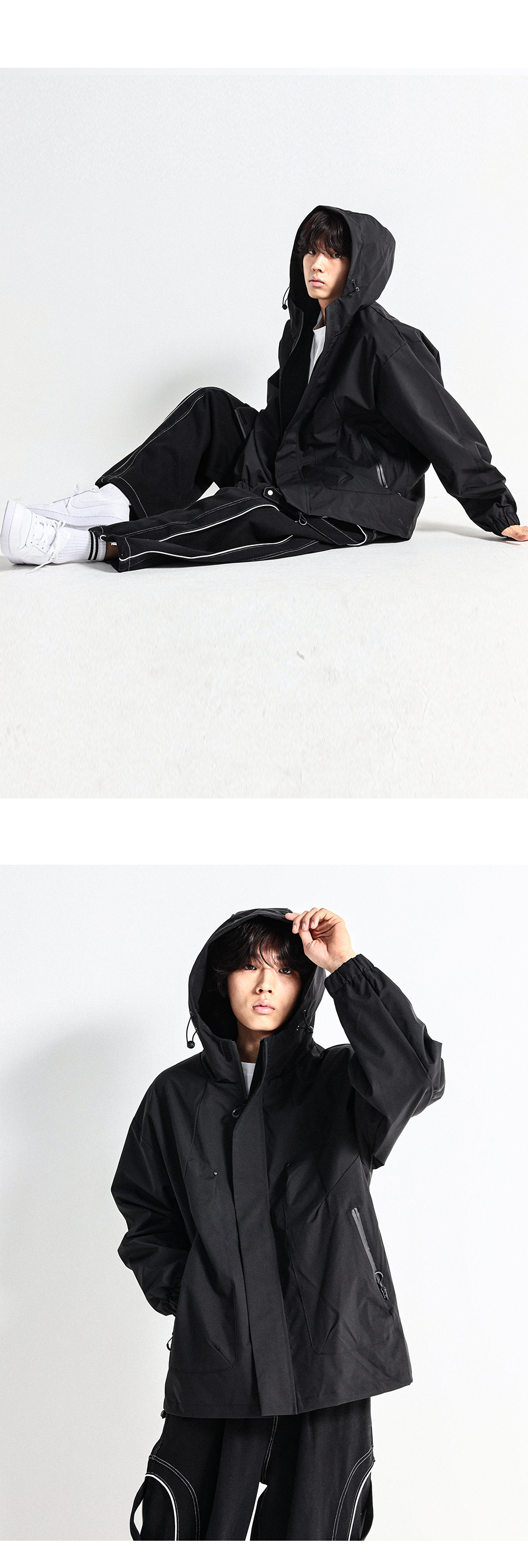 간절기에 입기 좋은 바람막이 점퍼로 밑단 스트링으로 다양한 연출이 가능하고 이중지퍼로 고급스러운 마감과 디테일