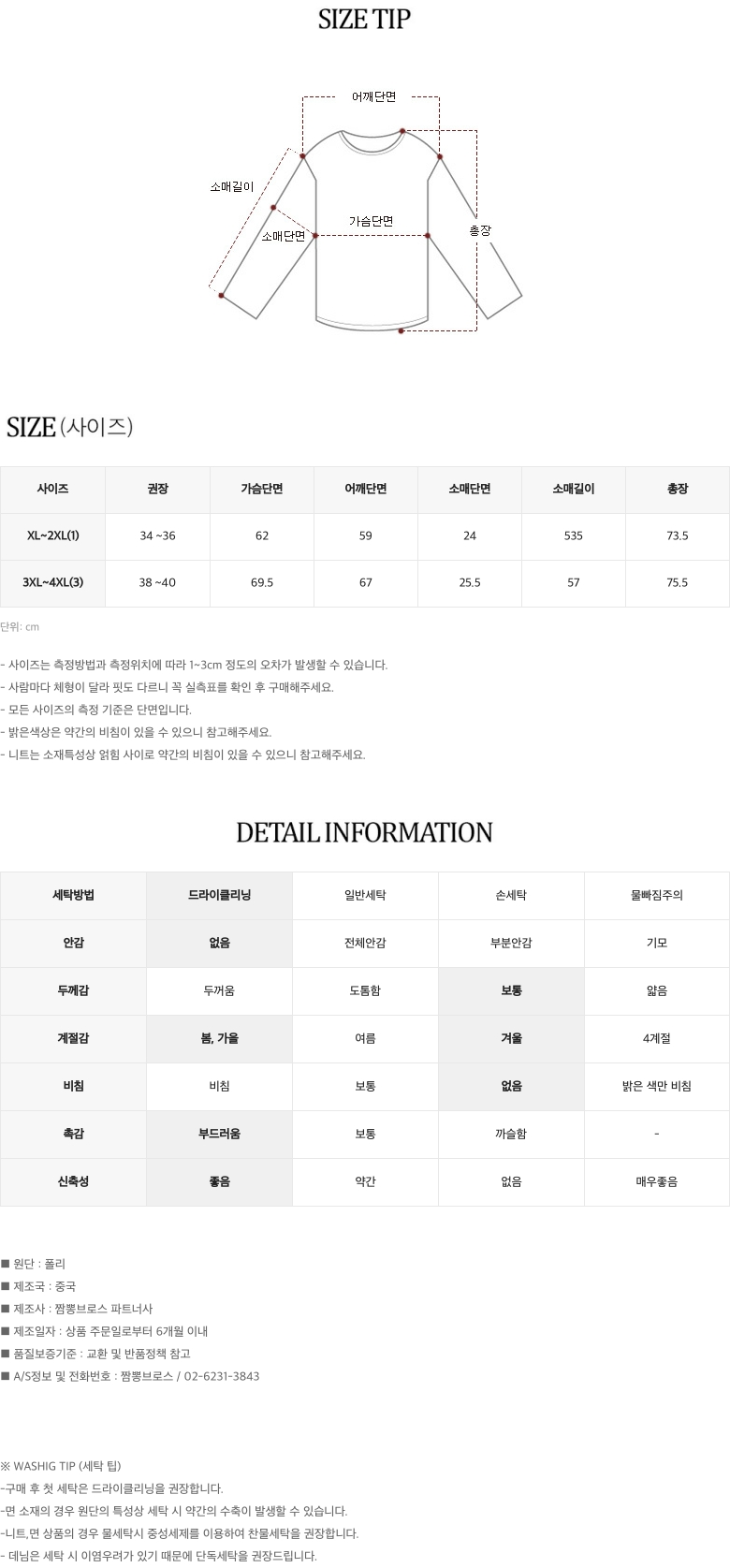 | 세탁방법및 취급시 주의사항 | 상세설명참조 | ||