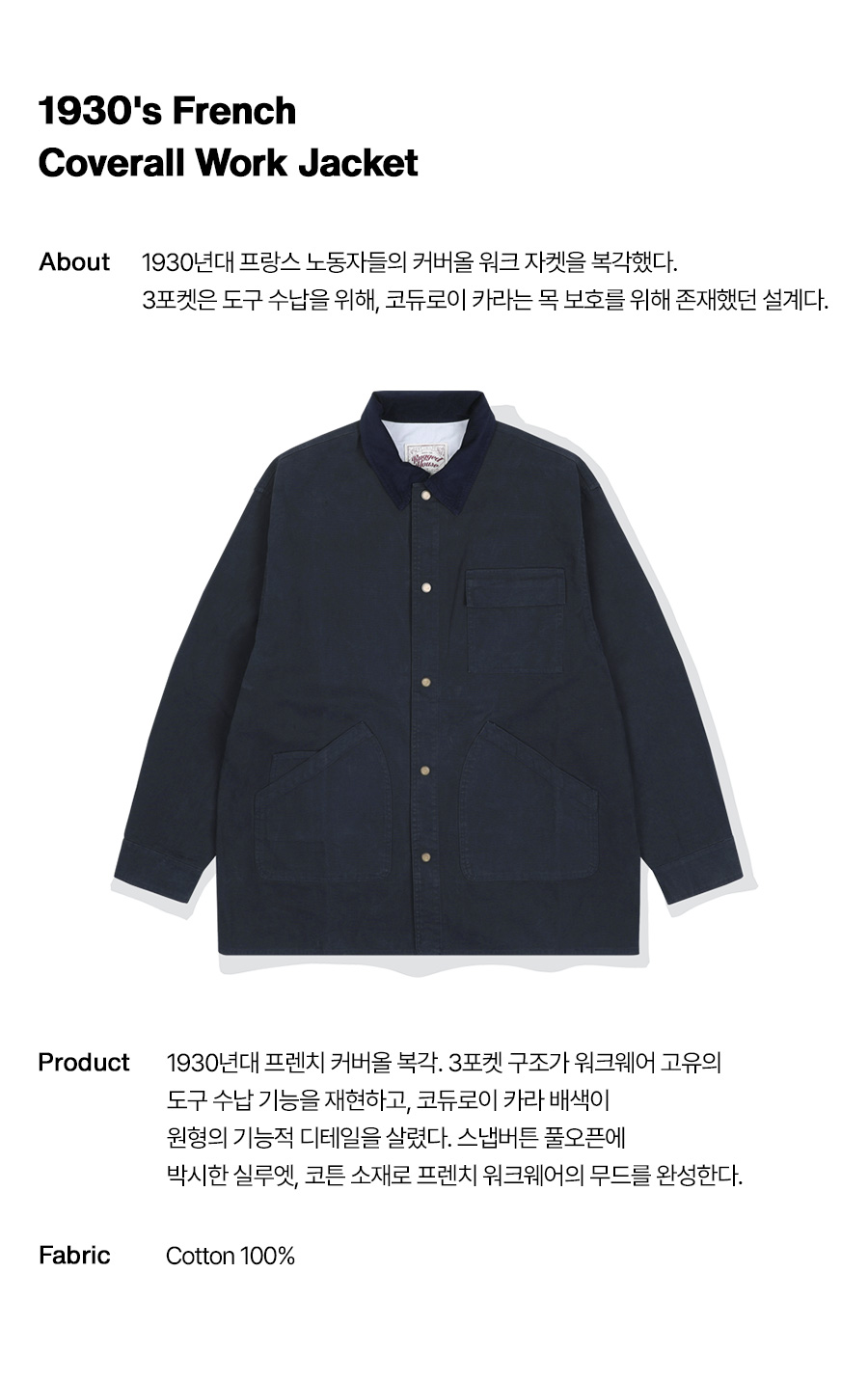 ⦁ 1930년대 프랑스 노동자들의 커버올 워크 자켓을 현대적으로 복각한 프렌치 워크 자켓