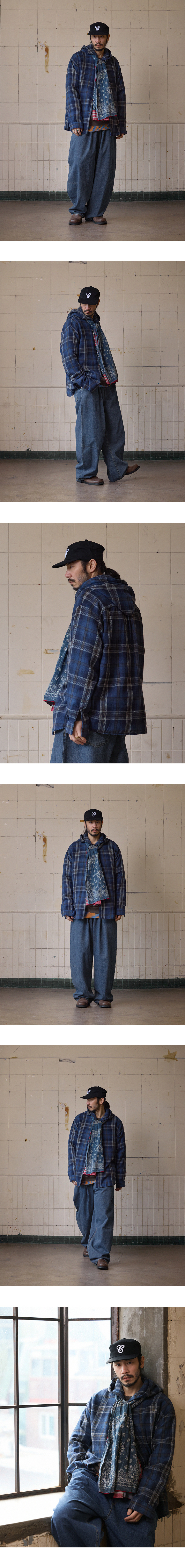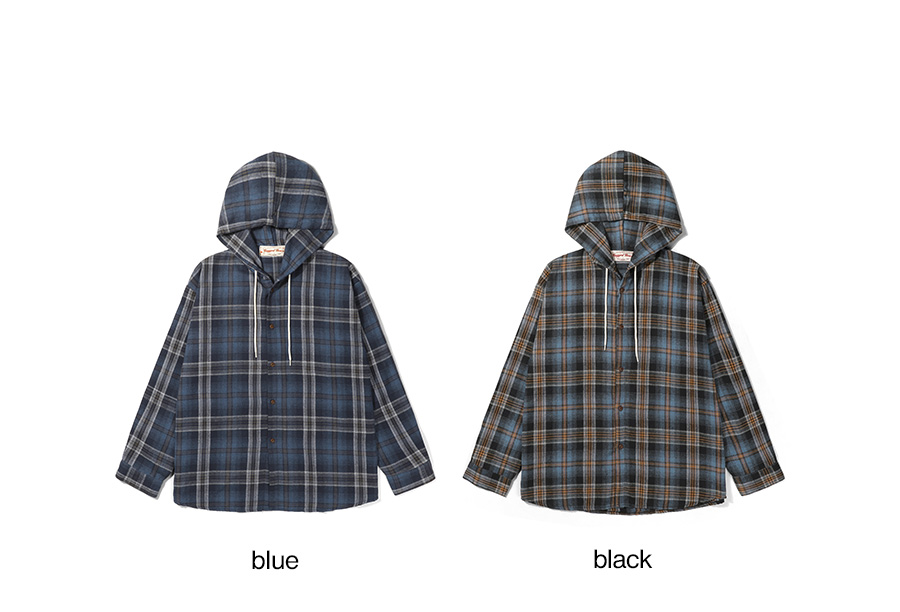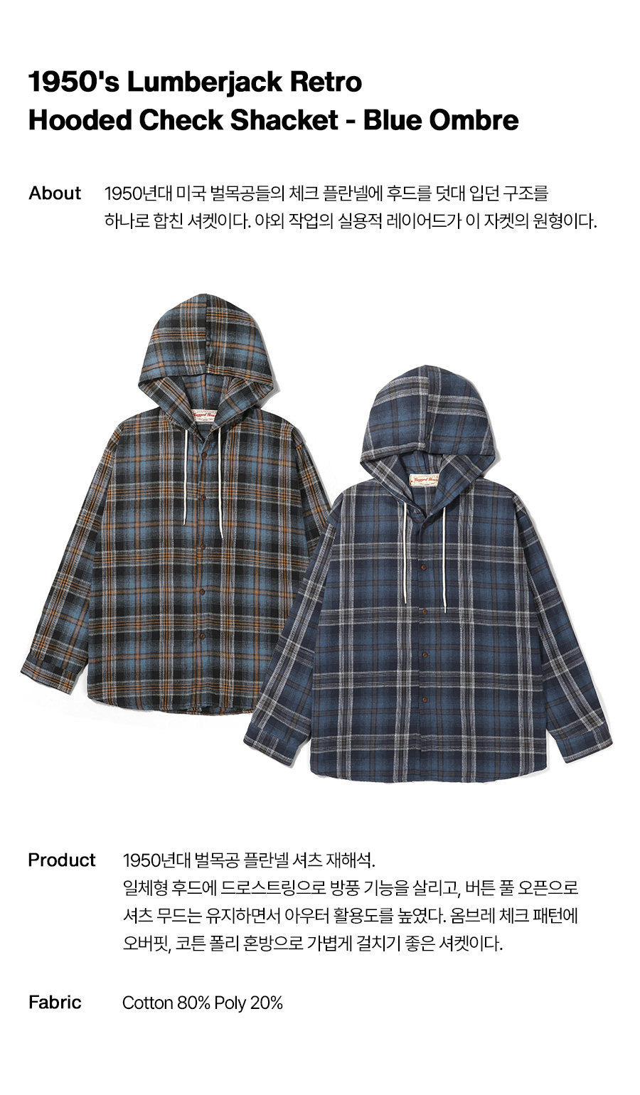 ⦁ 1950년대 미국 벌목공들의 플란넬 체크 워크 셔츠를 현대적으로 재해석한 후드 셔켓.