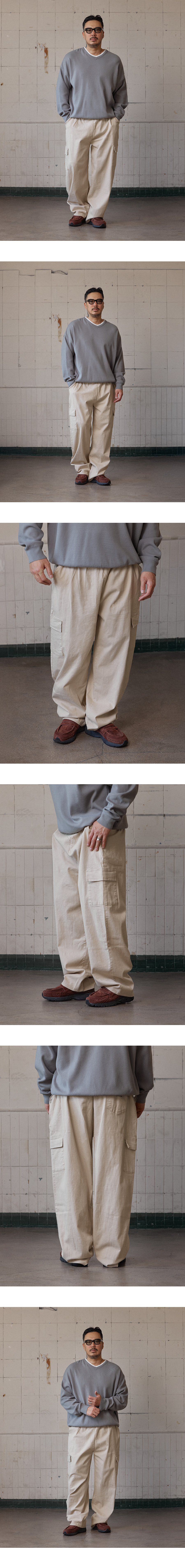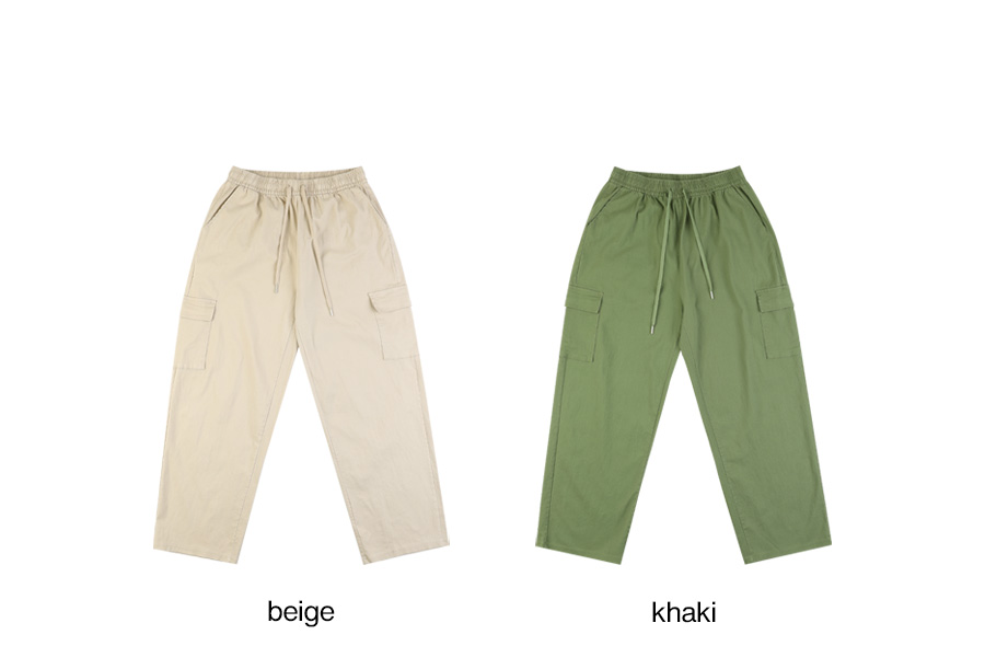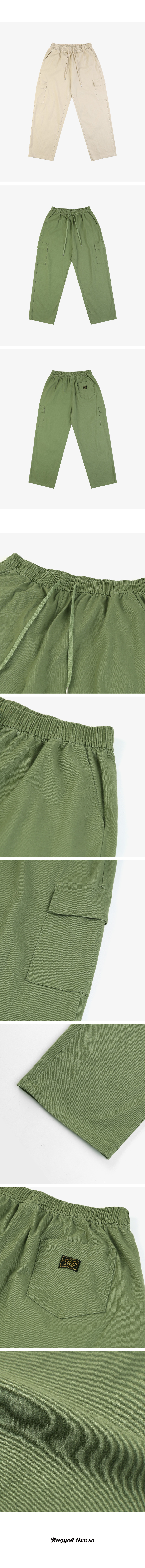 ⦁ 베이지 워시드 코튼 바디, 허리 밴딩 + 드로스트링, 허벅지 카고 포켓 구성.
