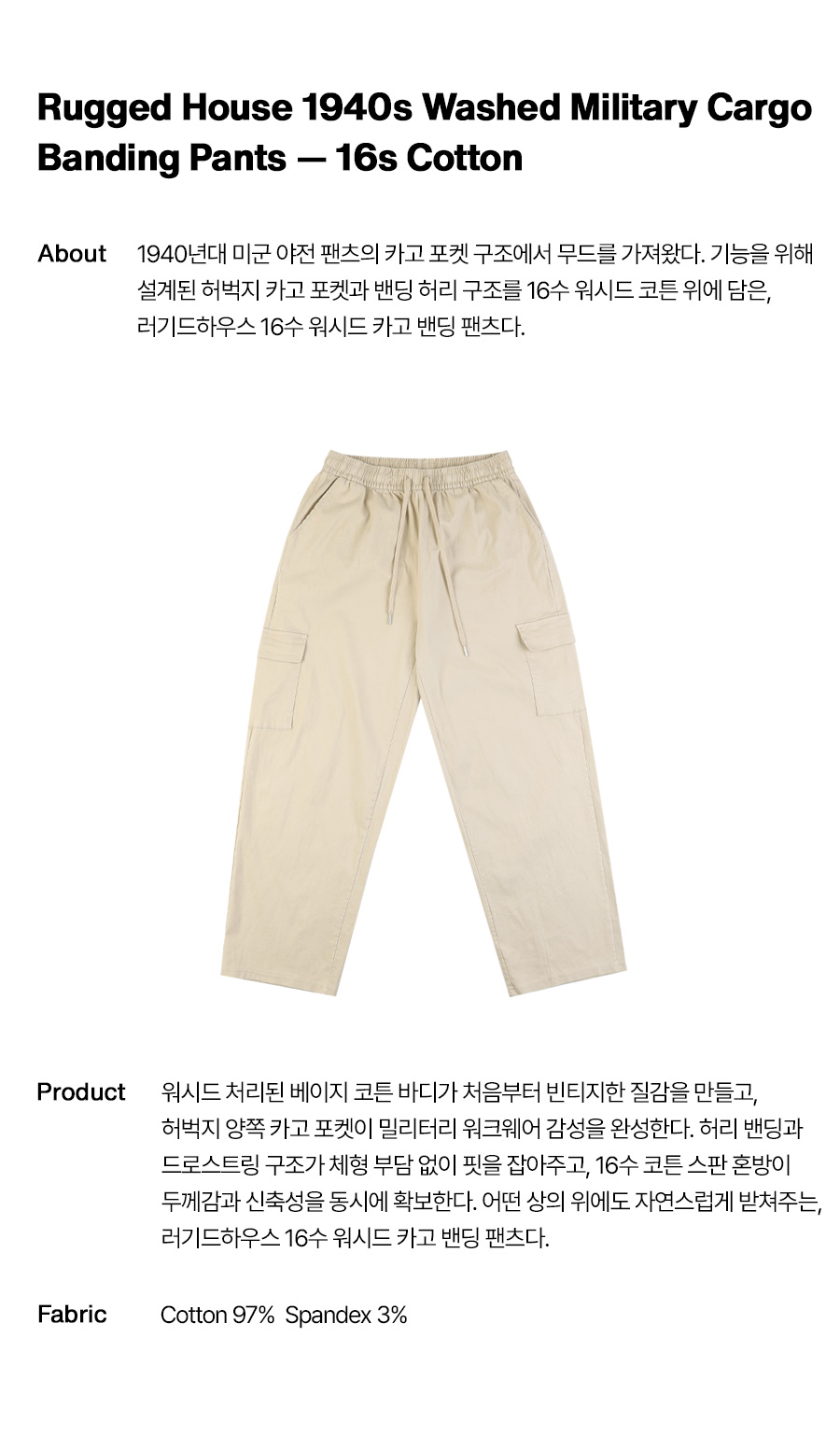 ⦁ 기능적 설계를 일상으로 꺼낸, 러기드하우스 16수 워시드 카고 밴딩 팬츠