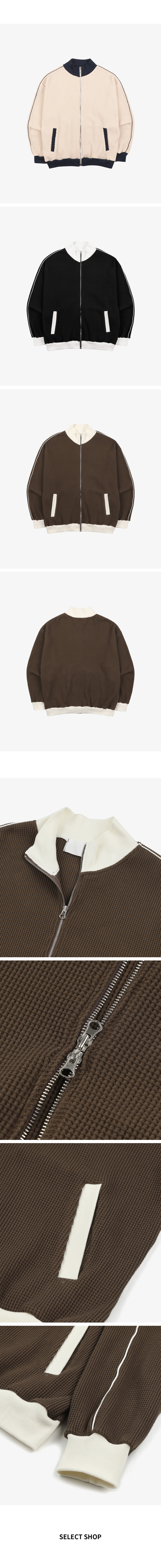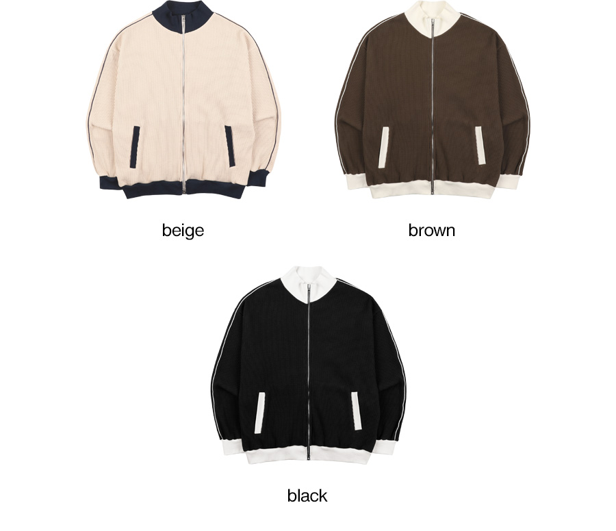 ⦁ 하이넥 형태의 배색 카라 디자인과 소매, 밑단의 밴딩 마감으로 스포티하면서도 캐주얼한 무드 연출