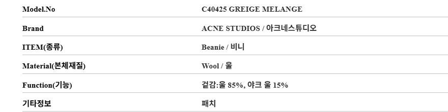 | 1. 종류 | 비니 | 2. 소재 | 울 |
