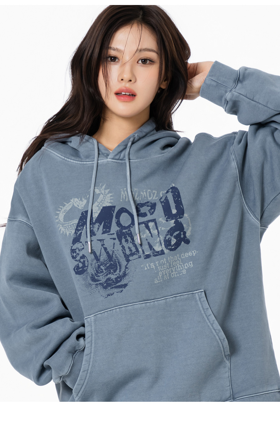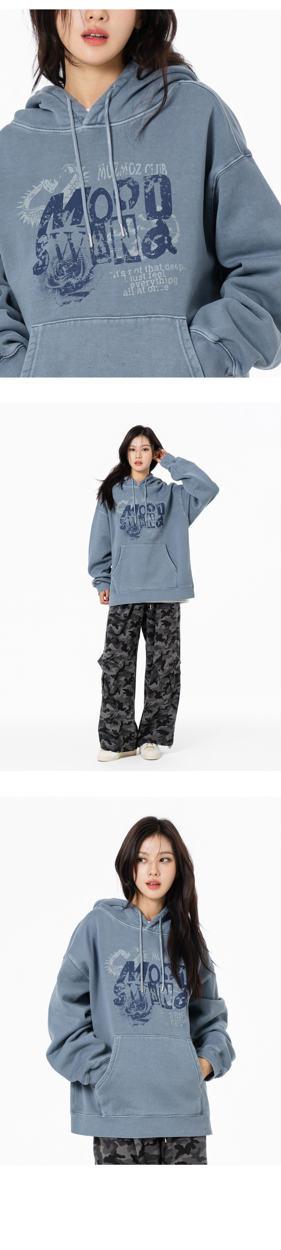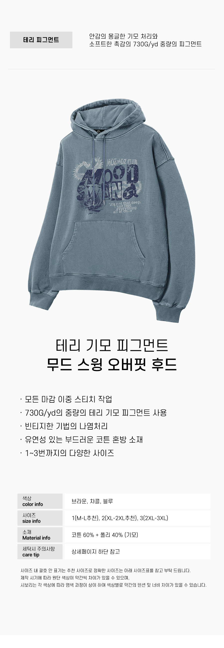 무드스윙 테리 기모 피그먼트 오버핏 후드 블루