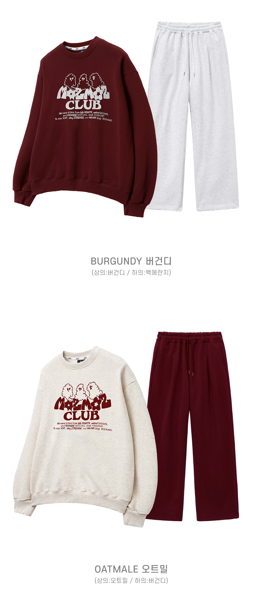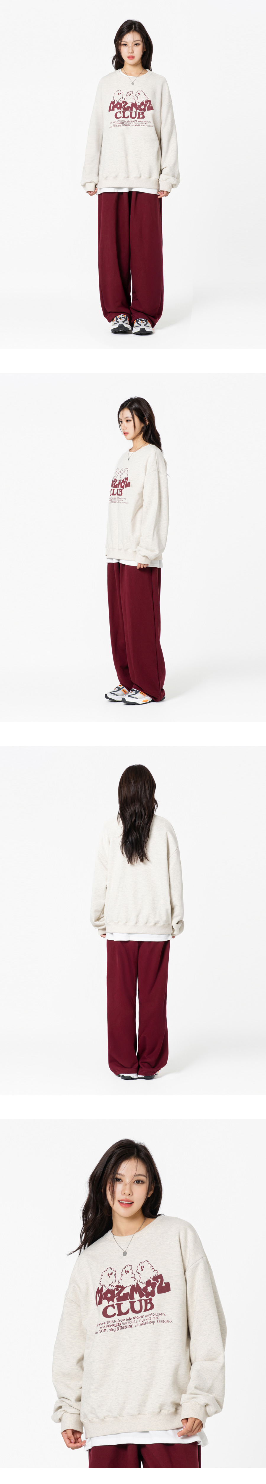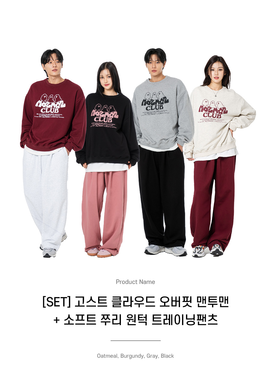 [SET] 고스트 클라우드 오버핏 맨투맨 + 소프트 쭈리 원턱 트레이닝팬츠 버건디