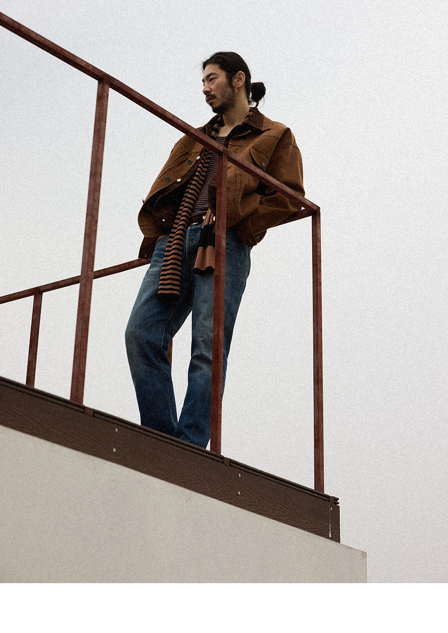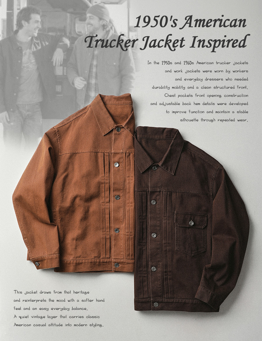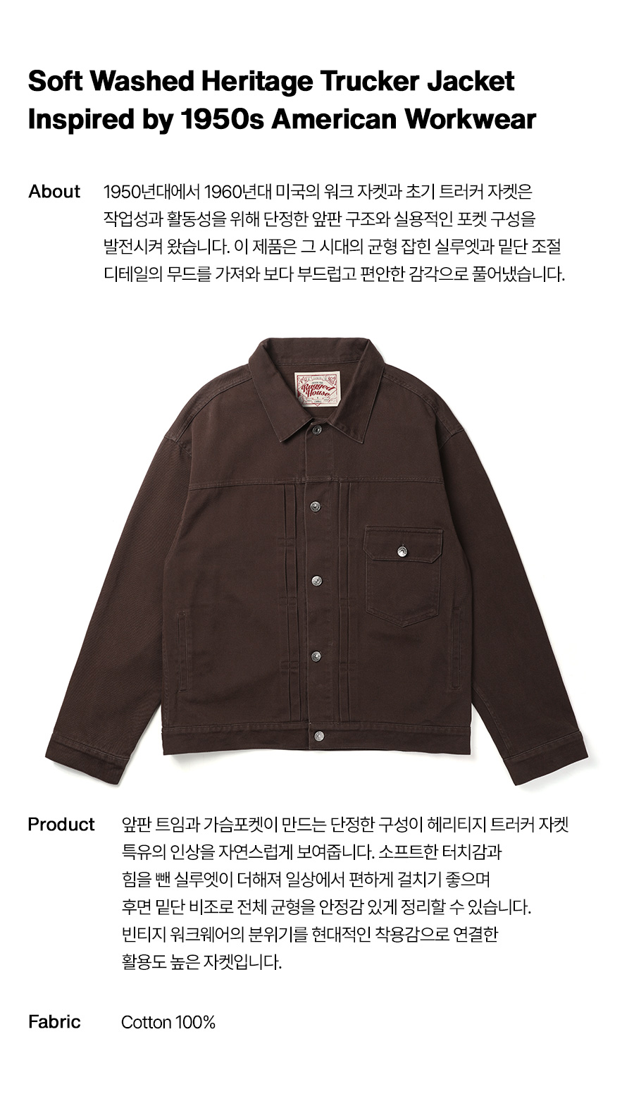 ⦁ 1950년대에서 1960년대 사이 미국 워크웨어와 초기 트러커 자켓의 무드에서 영감을 받은 소프트 워시드 트러커 자켓입니다.