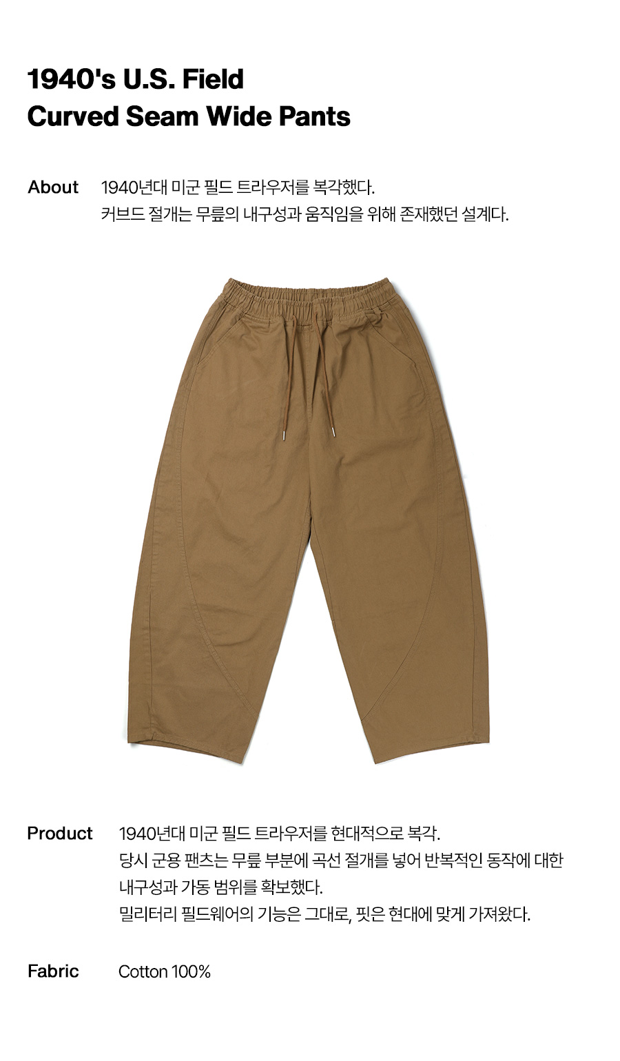 ⦁ 1940년대 미군 필드 트라우저를 현대적으로 복각한 커브드 시임 와이드 팬츠.