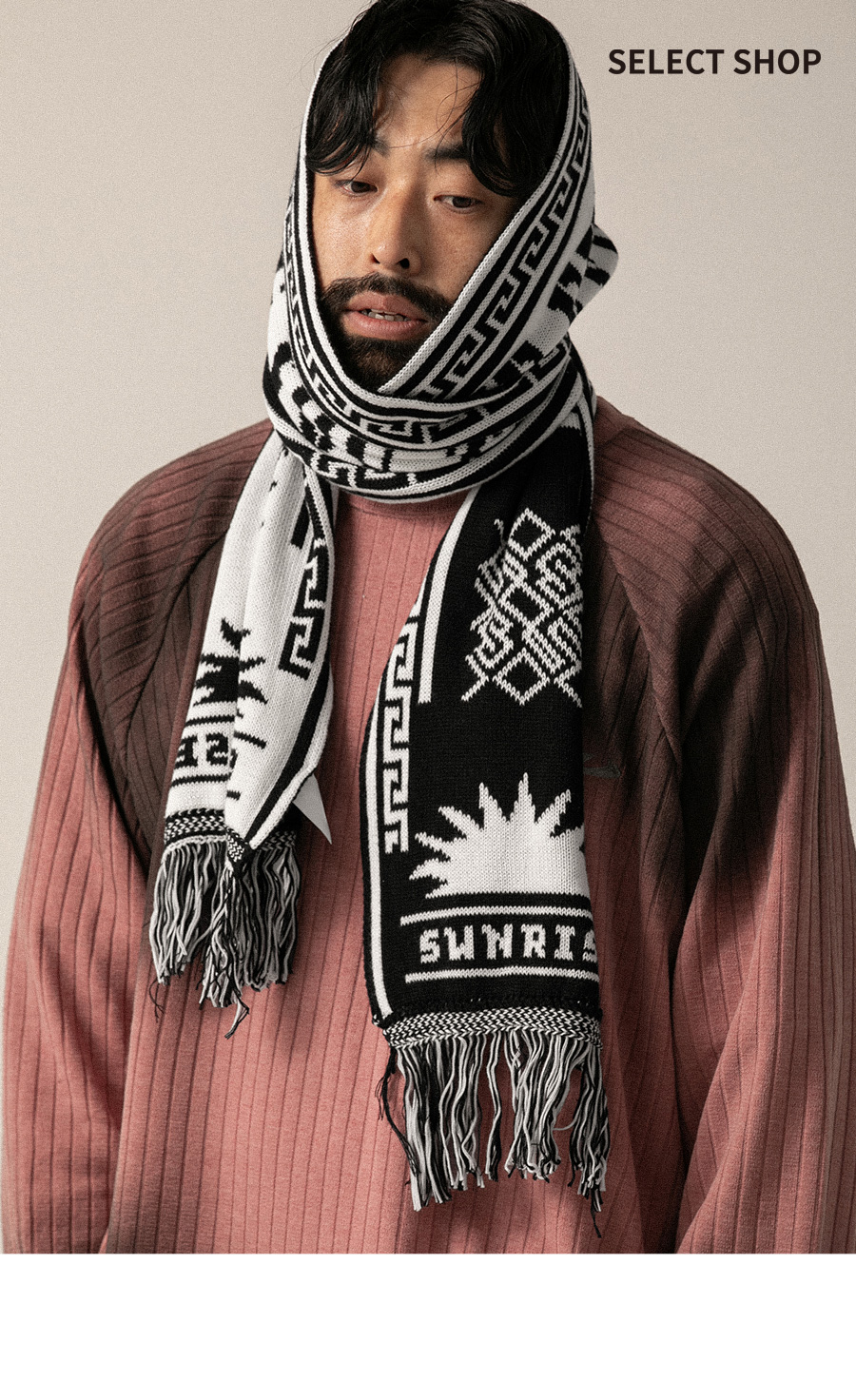 ⦁ 기하학적인 라인 패턴과 레터링이 조화를 이루는 롱 머플러입니다.