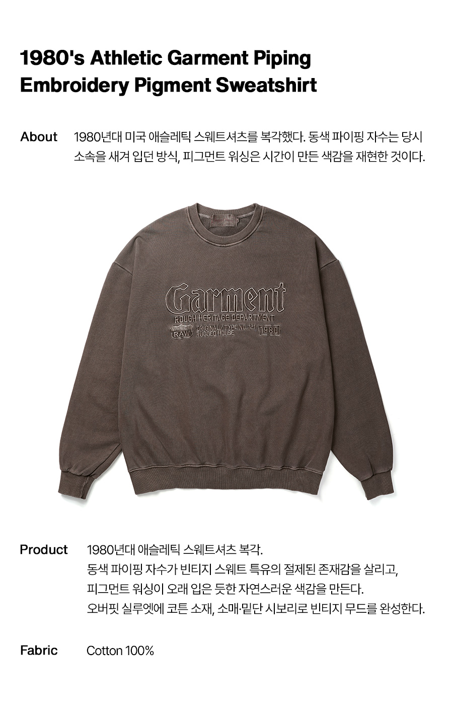 가먼트 파이핑 자수 피그먼트 맨투맨 브라운