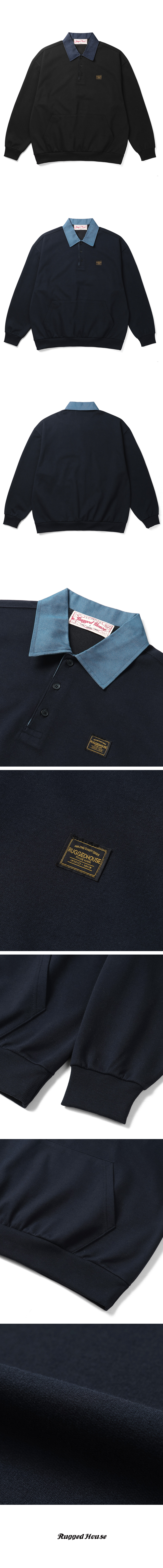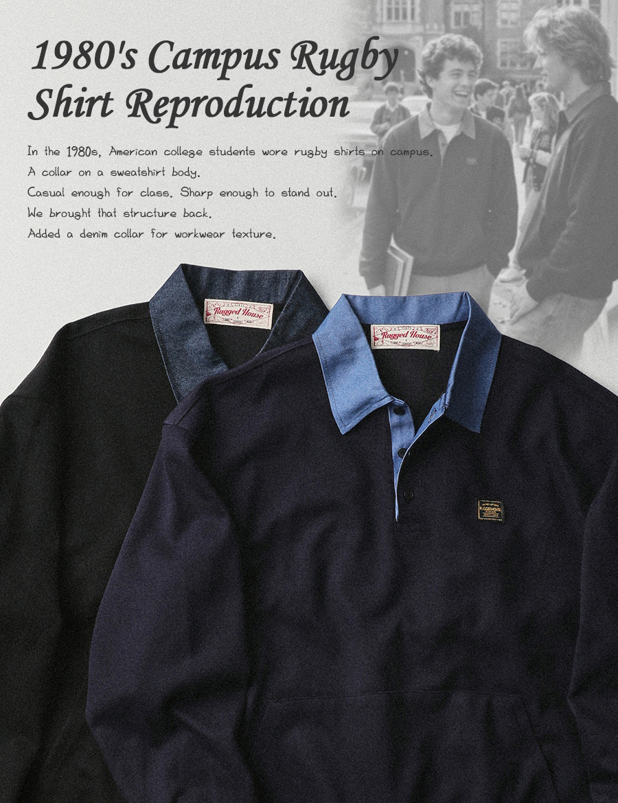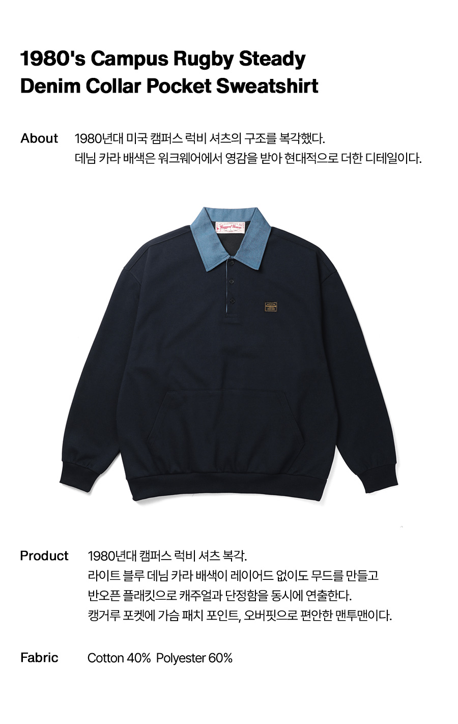 ⦁ 1980년대 미국 캠퍼스 럭비 셔츠의 구조를 복각한 카라 포켓 맨투맨.