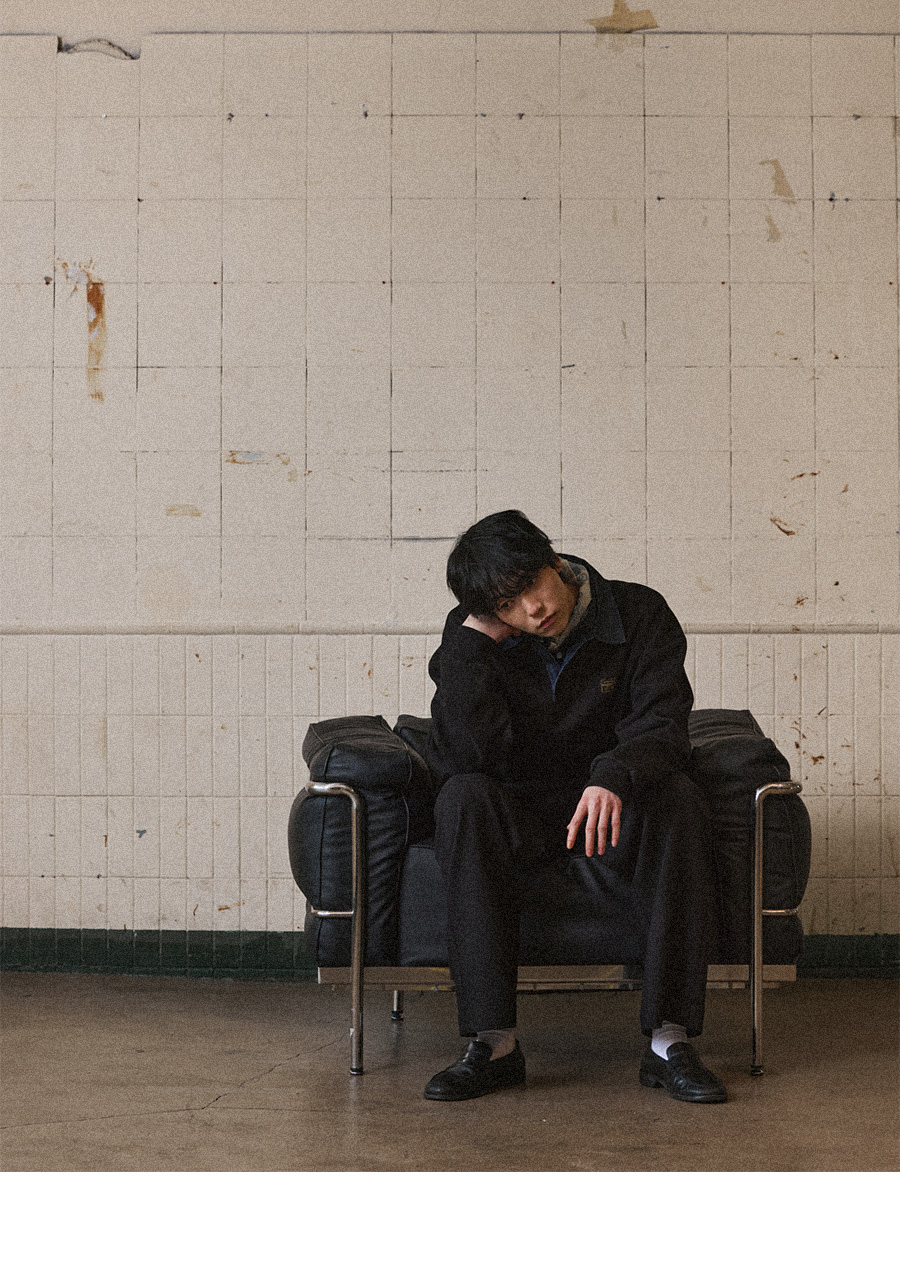 ⦁ 라이트 블루 데님 카라 배색이 워크웨어의 거친 질감을 더해 맨투맨에 레이어드 없이도 무드를 만든다.