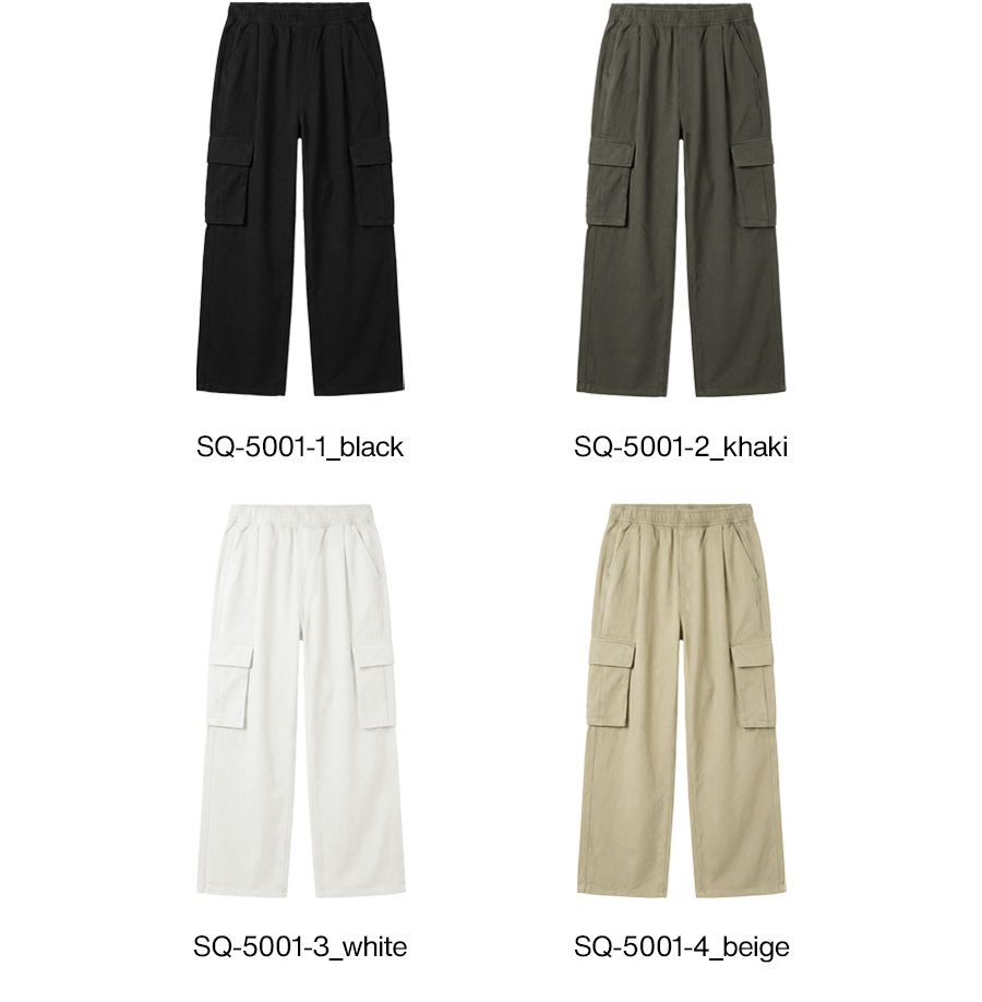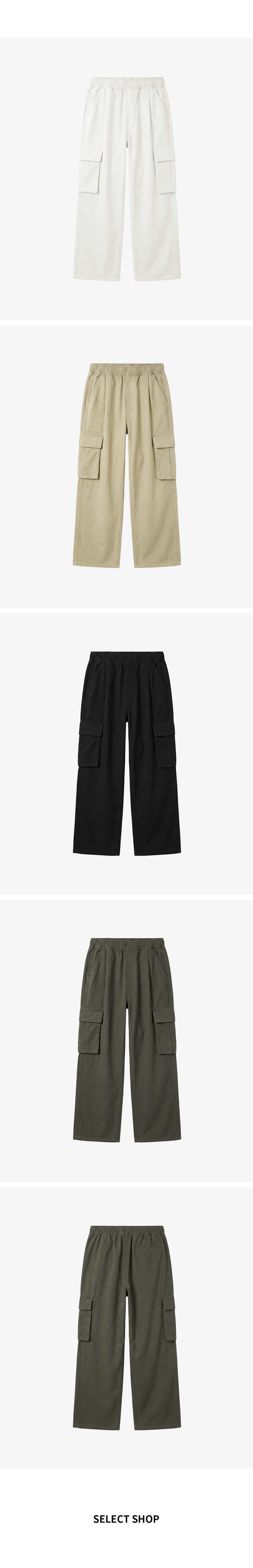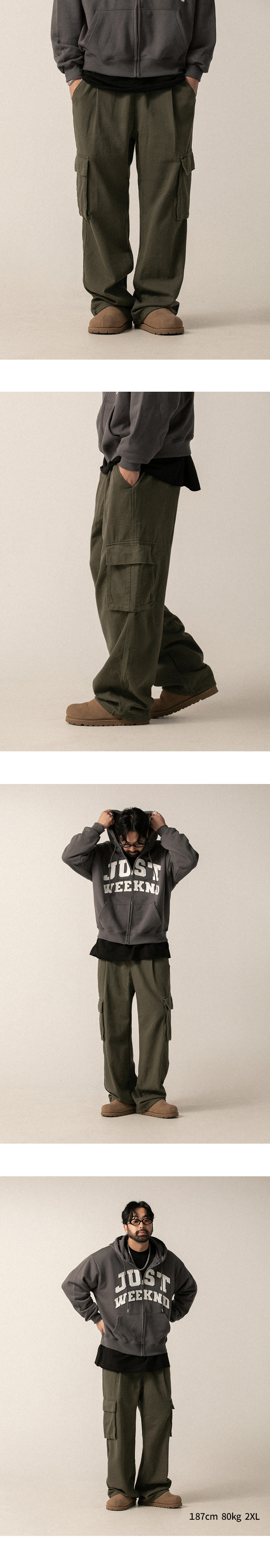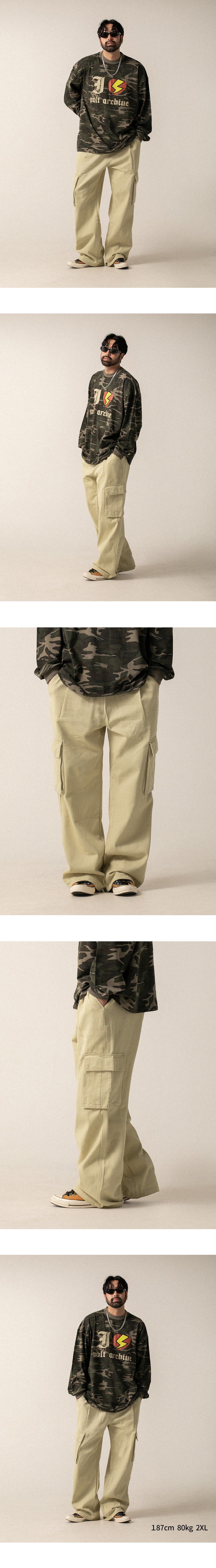 ⦁ 양쪽 허벅지에 배치된 플랩 카고 포켓이 밀리터리한 무드를 완성하는 와이드 카고 팬츠입니다.