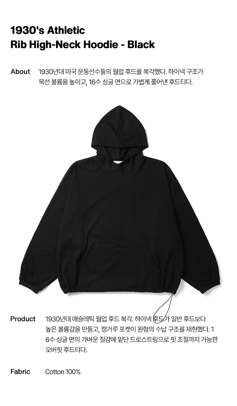 ⦁ 1930년대 미국 운동선수들의 애슬레틱 웜업 후드를 현대적으로 복각한 리브 하이넥 후드티.