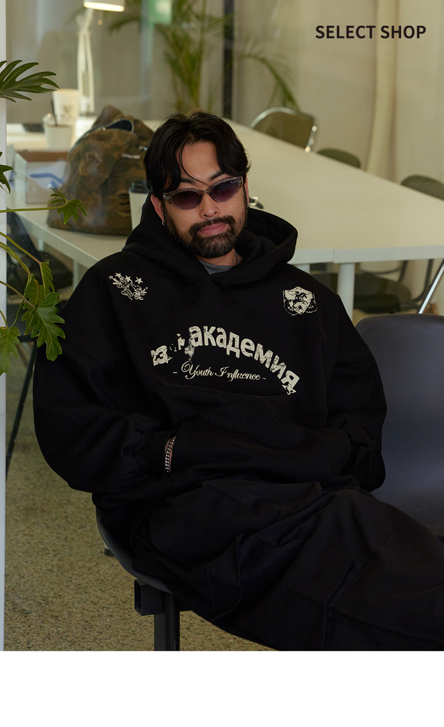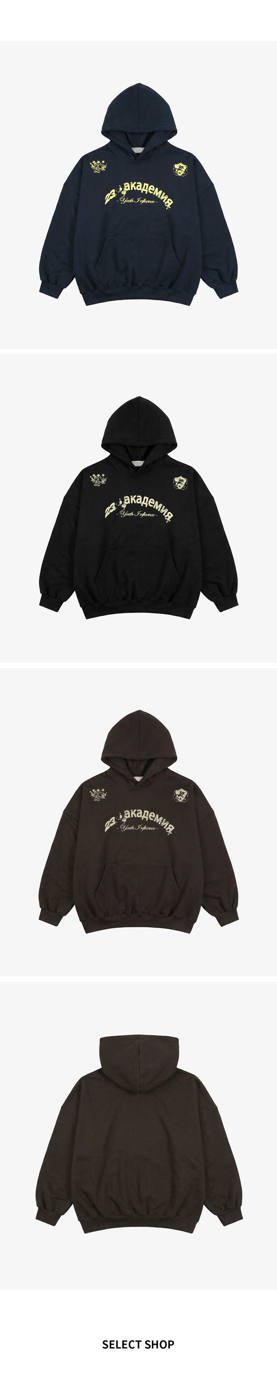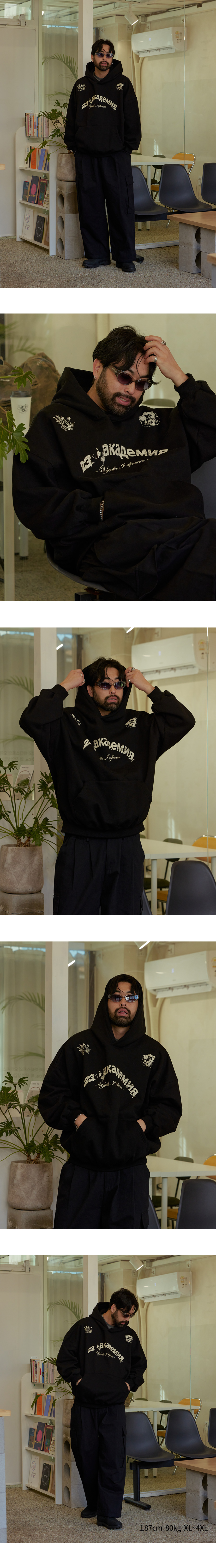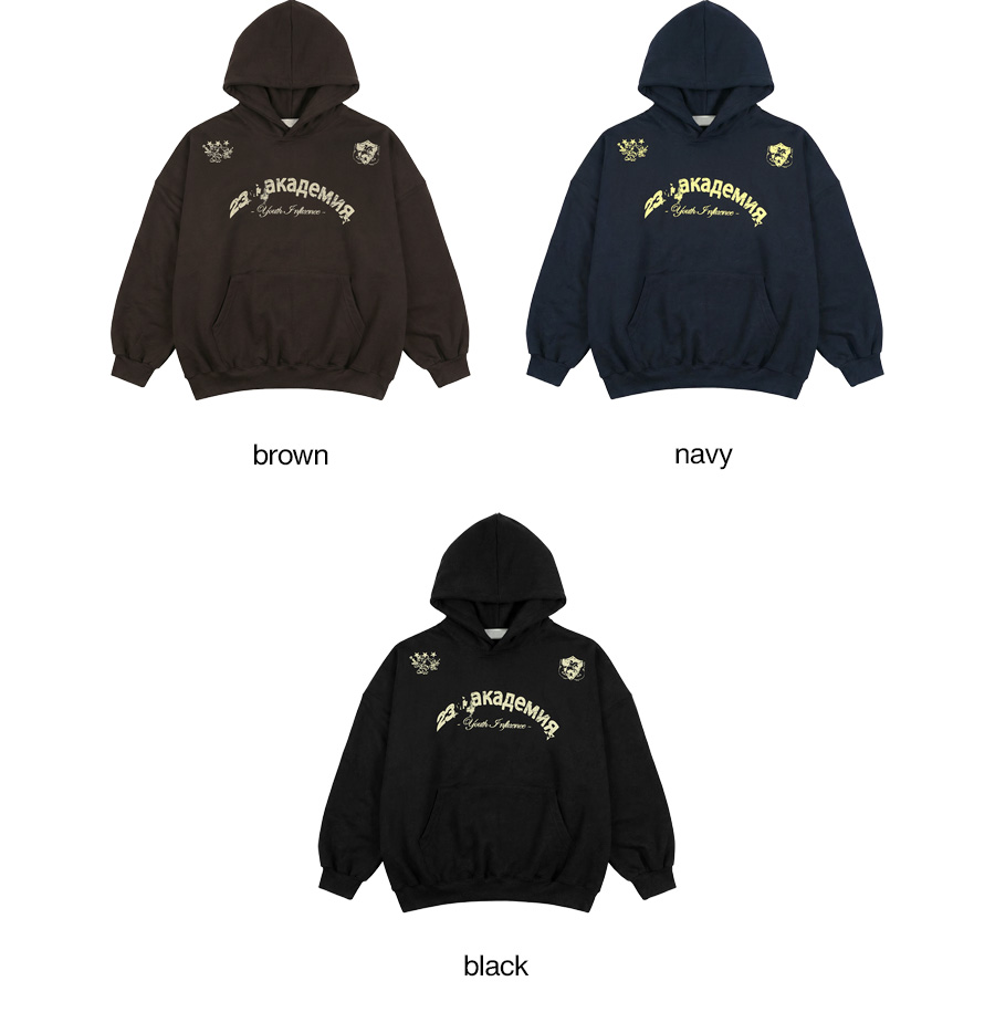 ⦁ 가슴 중앙에 아치형 레터링과 양쪽 어깨에 엠블럼 그래픽을 배치해 컬리지 무드를 완성하는 오버핏 후드티입니다.