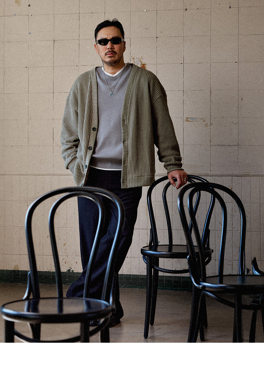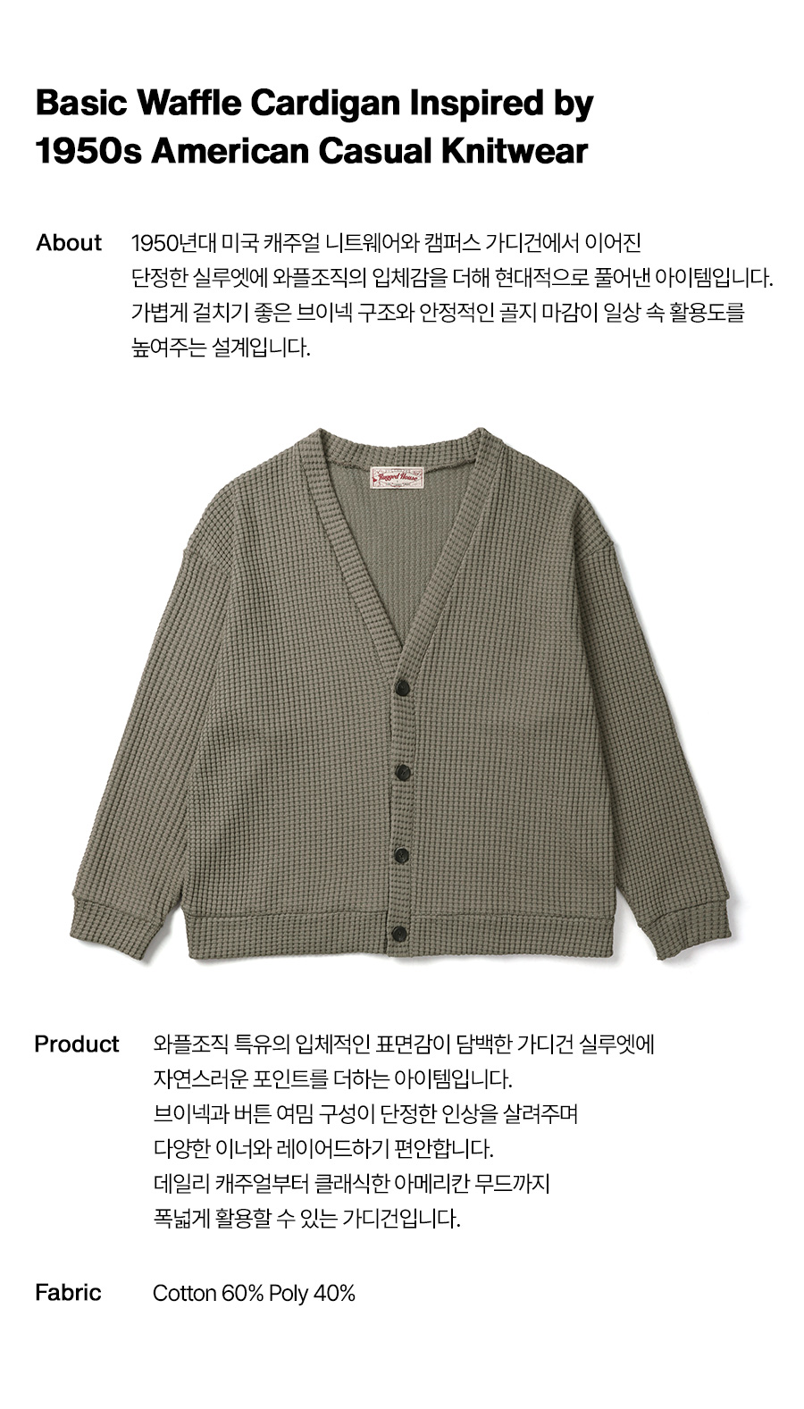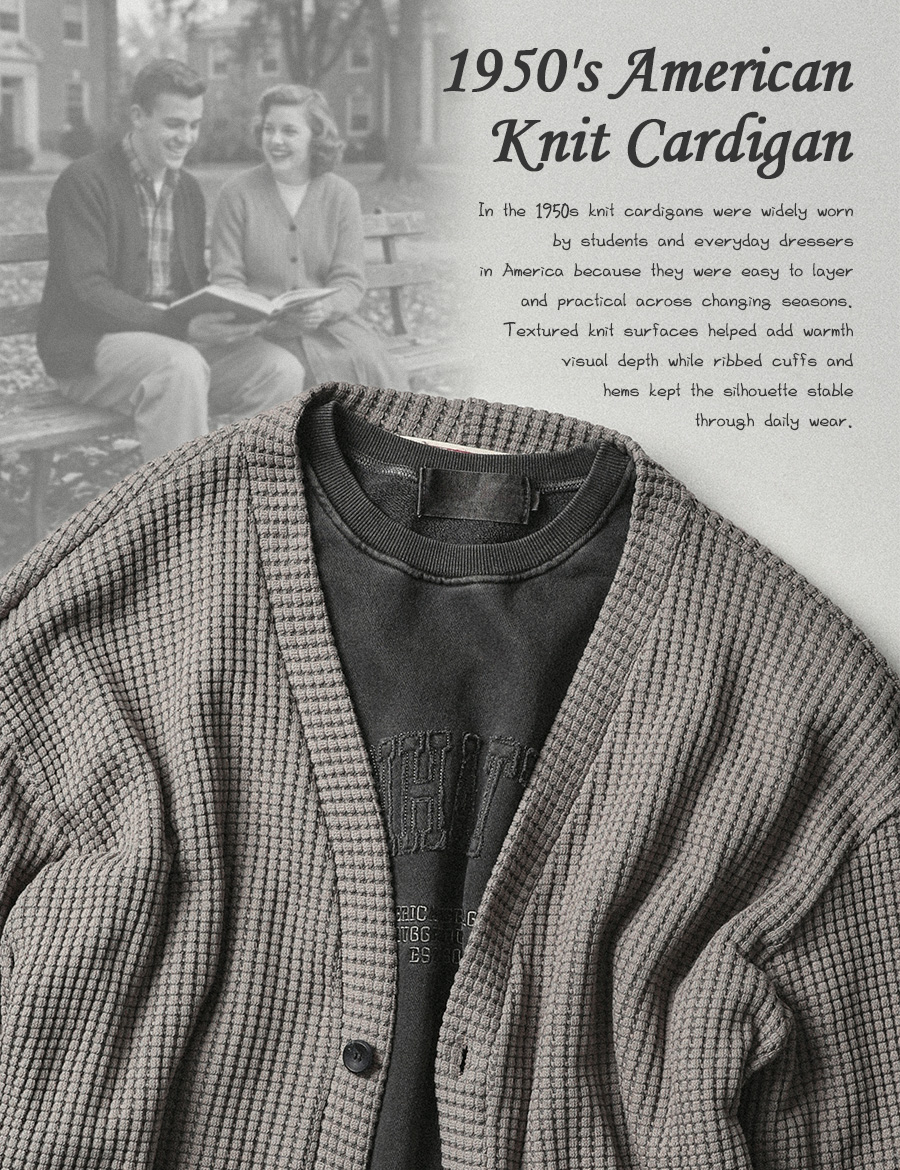 ⦁ 1950년대 미국 캐주얼웨어와 캠퍼스 니트웨어에서 이어진 담백한 가디건 무드를 바탕으로 일상에 자연스럽게 스며들도록 풀어낸 아이템입니다.