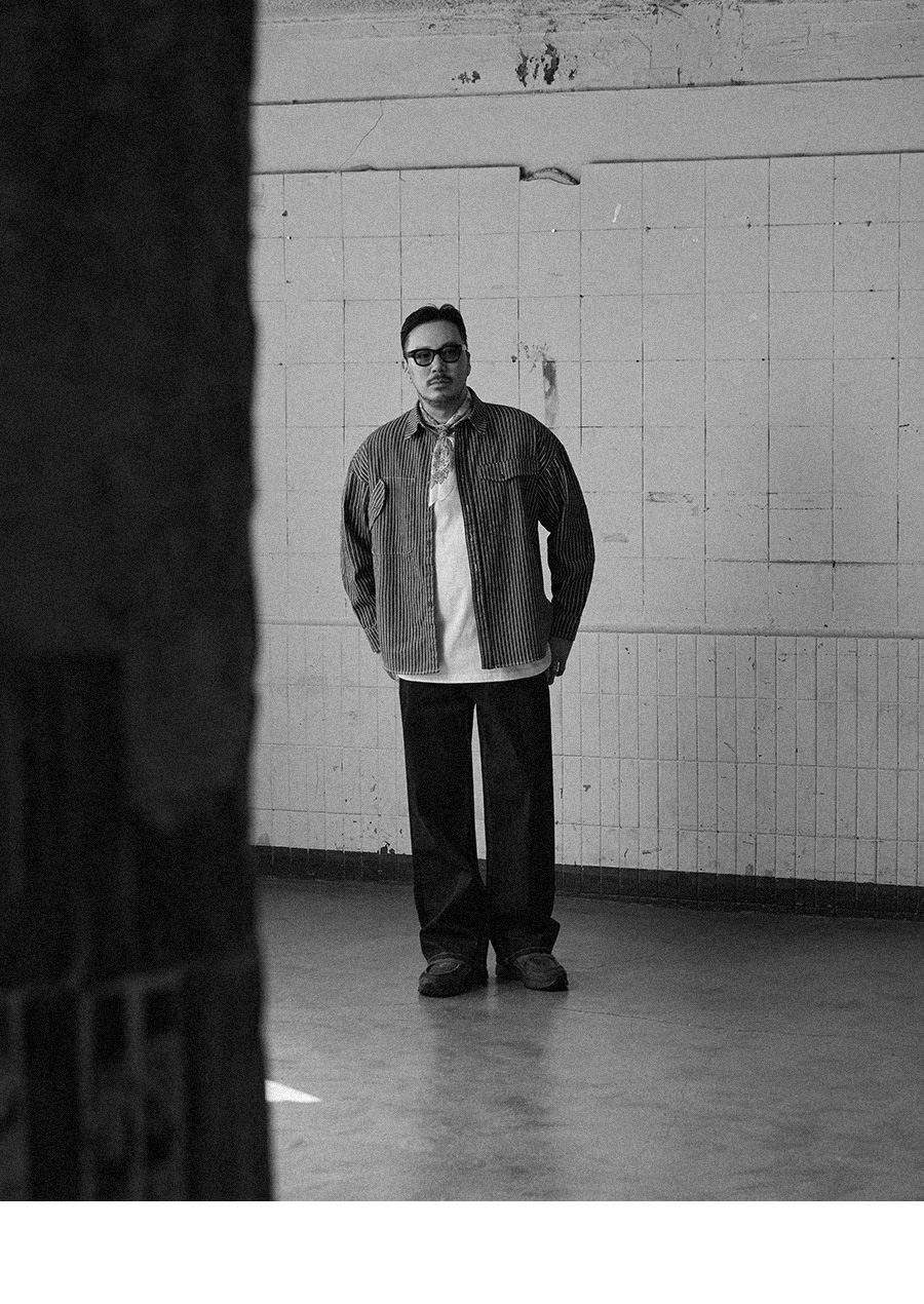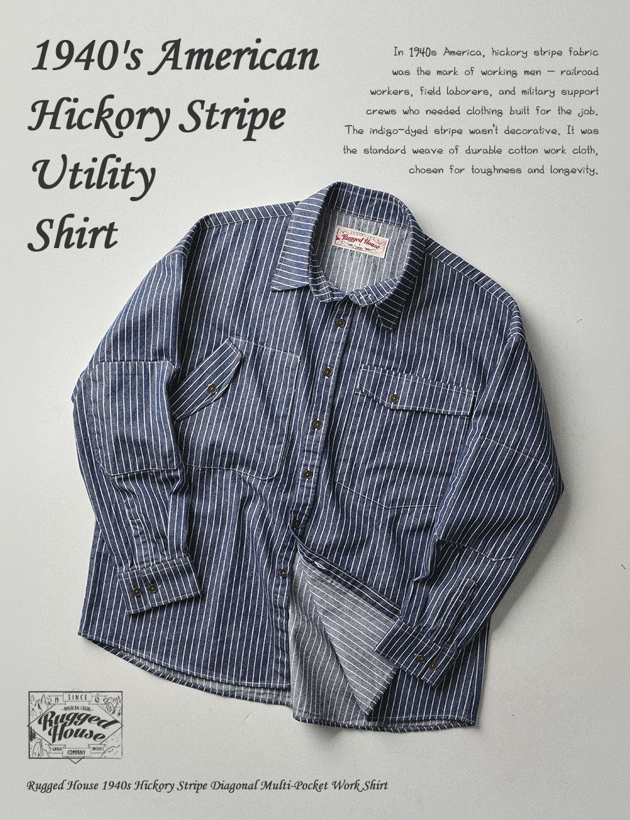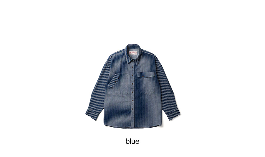 ⦁ 1940년대 미국 철도 노동자·야전 작업자들이 입던 히코리 스트라이프 유틸리티 셔츠의 구조에서 무드를 가져왔다.