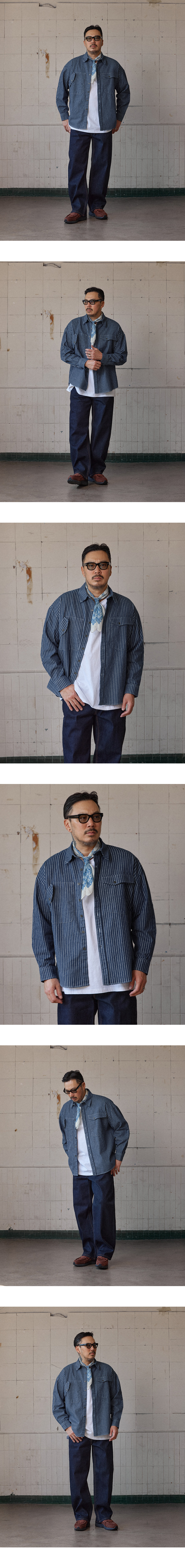 ⦁ 인디고 데님 스트라이프 바디, 다방향 대각선 포켓 구성, 코튼 버튼 여밈.