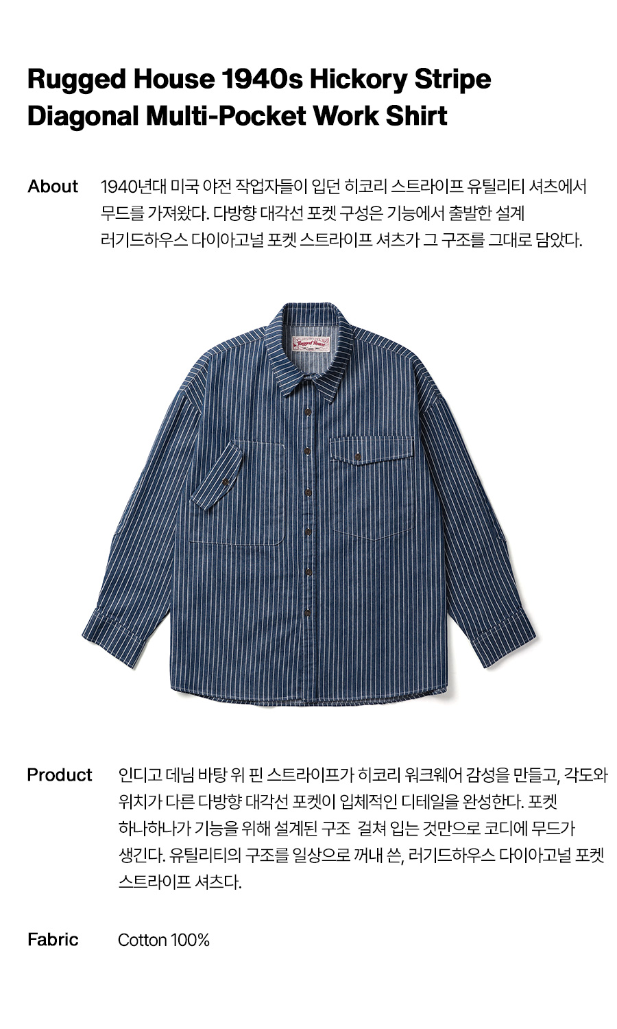 ⦁ 기능적 설계를 스타일로 전환한, 러기드하우스 다이아고널 포켓 스트라이프 셔츠다.