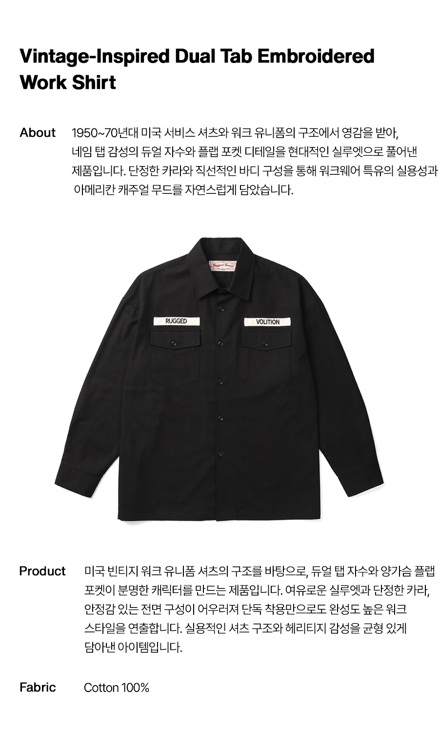 ⦁ 러기드하우스가 빈티지 워크 셔츠의 상징을 일상용으로 정리한 한 장.