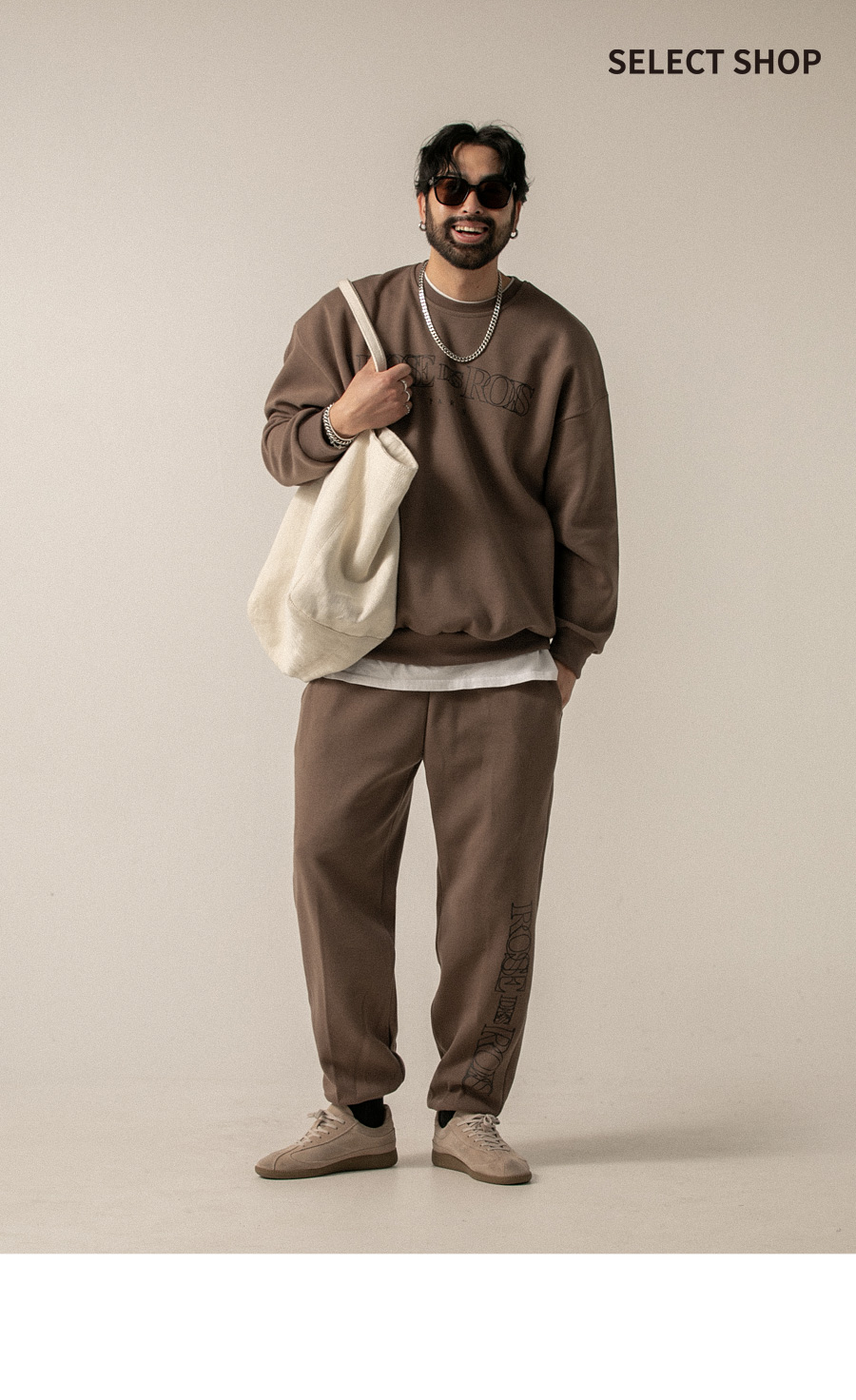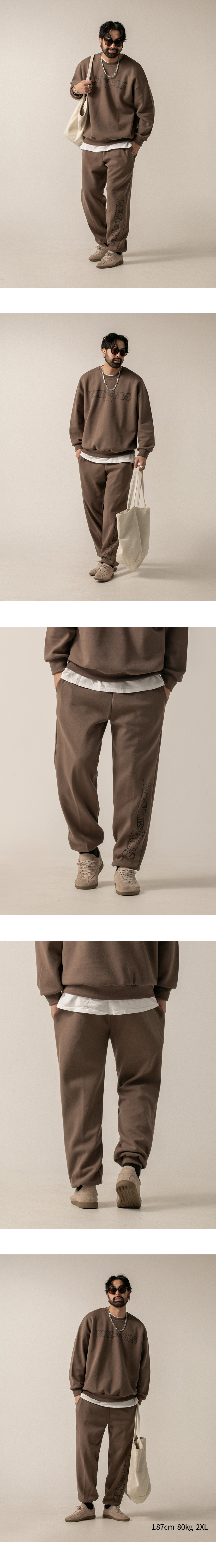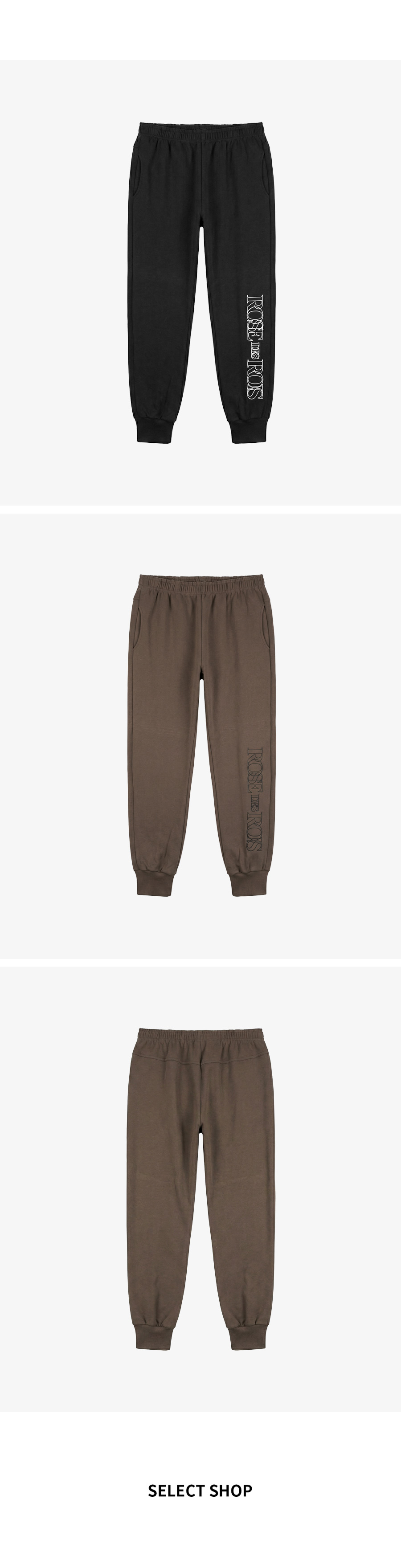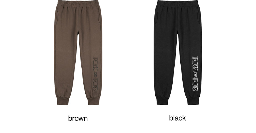 ⦁ 왼쪽 하단부의 감각적인 영문 레터링 나염 디테일이 돋보이는 조거 팬츠입니다