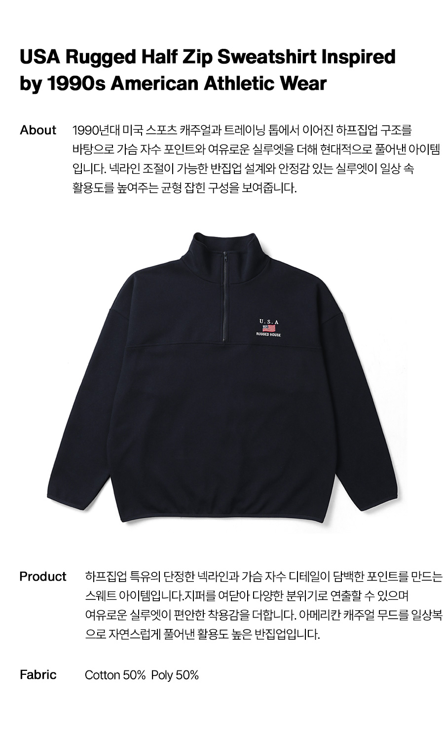 ⦁ 1990년대 미국 스포츠 캐주얼과 트레이닝 톱에서 이어진 담백한 하프집업 무드를 바탕으로 일상에 자연스럽게 녹여낸 아이템입니다.