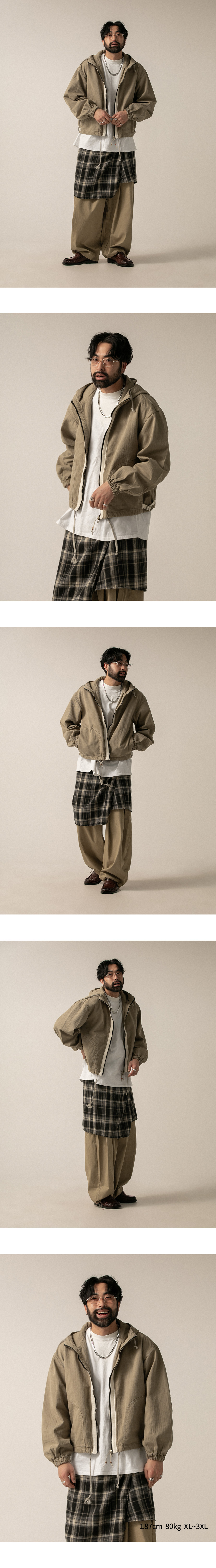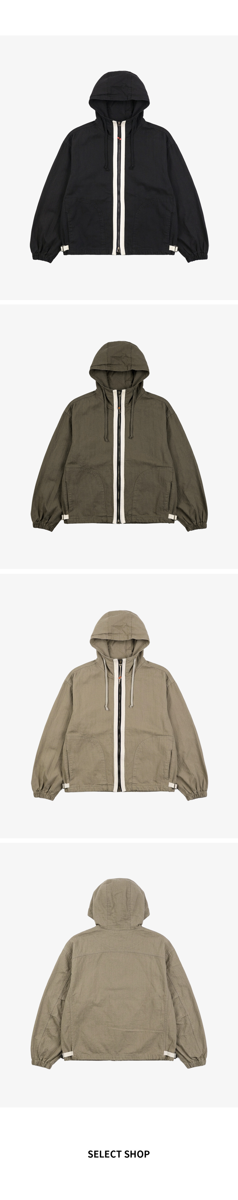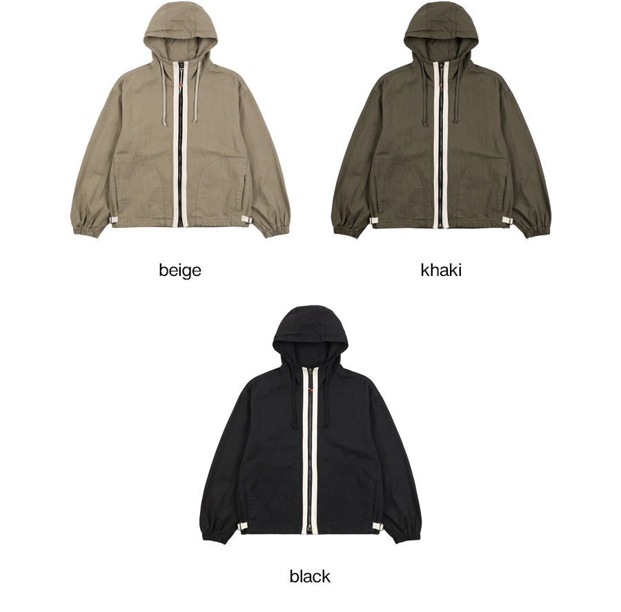 ⦁ 구성 : 전면 지퍼와 드로스트링 후드 소매 밴딩 포켓 디테일