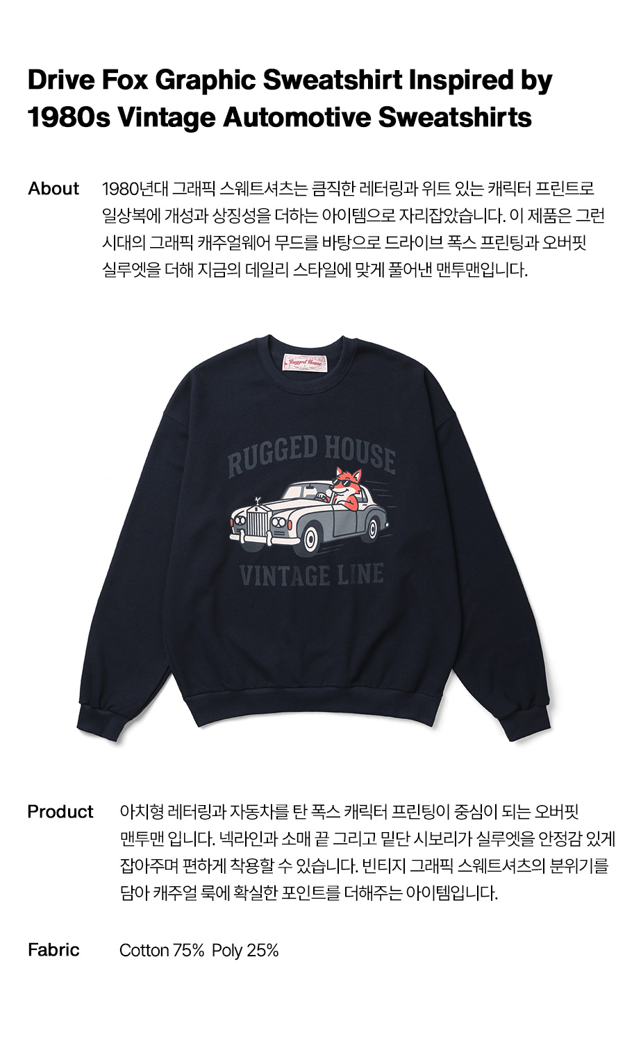 ⦁ 1980년대 그래픽 스웨트셔츠와 자동차 프린트 캐주얼웨어 무드에서 출발한 드라이브 폭스 맨투맨.