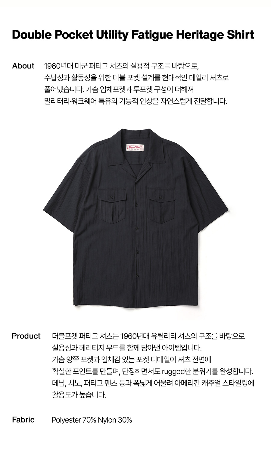 ⦁ 1960년대 미군 유틸리티 셔츠와 퍼티그 셔츠에서 영감을 받아 풀어낸 더블포켓 셔츠입니다.