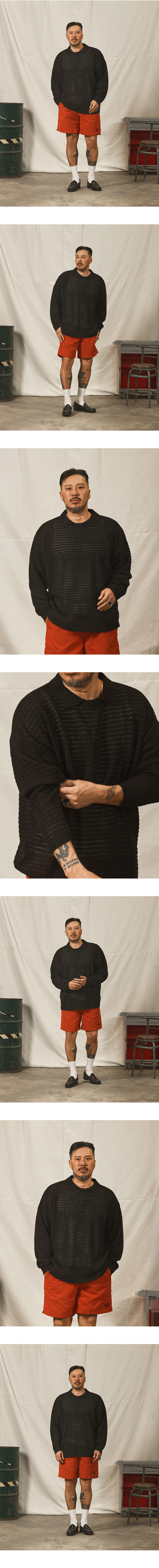 ⦁ 성기게 짜인 오픈 조직과 카라 디테일이 어우러진 오버핏 썸머 니트입니다.