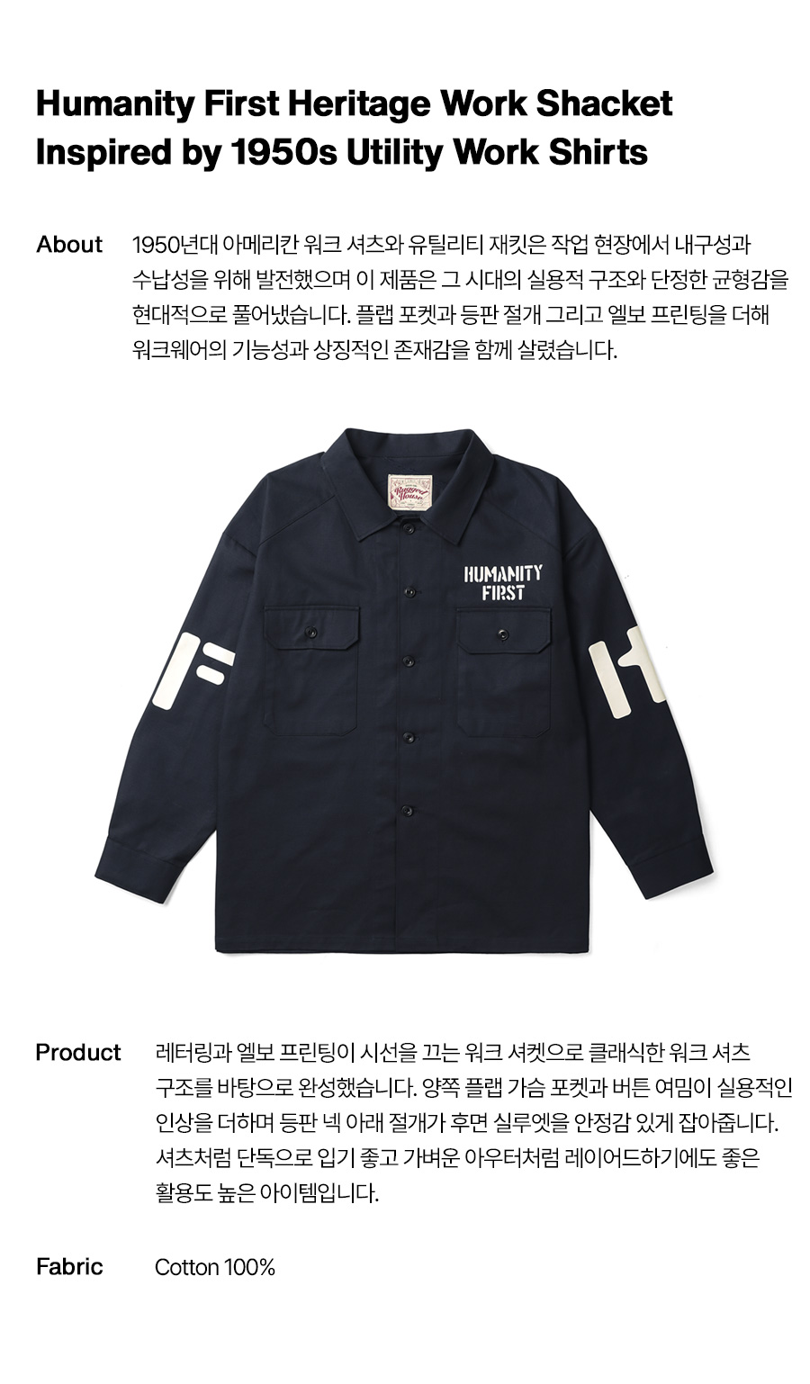 ⦁ 950년대 아메리칸 워크 셔츠와 유틸리티 재킷 무드에서 출발한 휴머니티 퍼스트 워크 셔켓.