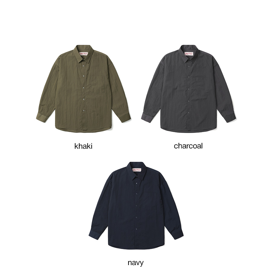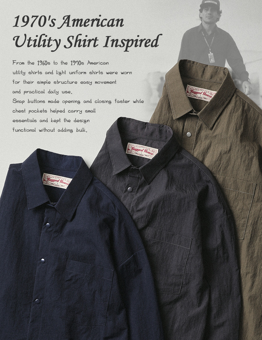 ⦁ 1960~70년대 미국 라이트 아우터형 셔츠와 유니폼 셔츠 무드에서 출발한 이지 스냅 버튼 나일론 셔츠.