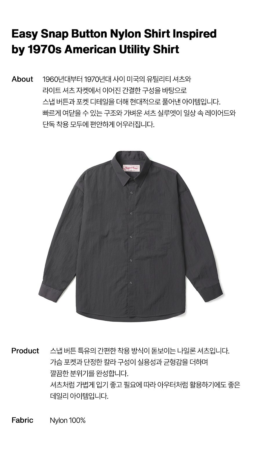 ⦁ 1960~70년대 미국 라이트 아우터형 셔츠와 유니폼 셔츠 무드에서 출발한 이지 스냅 버튼 나일론 셔츠.