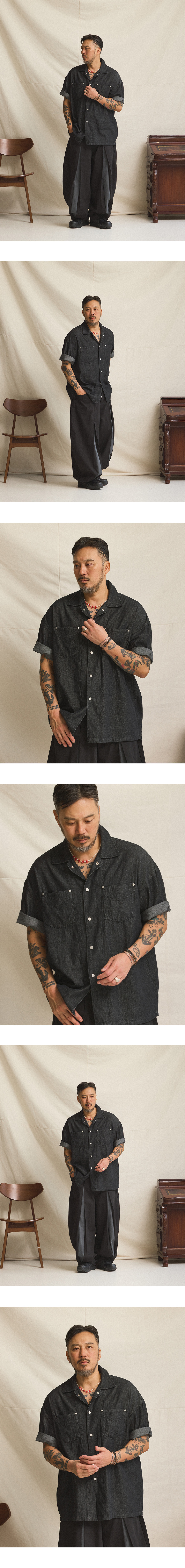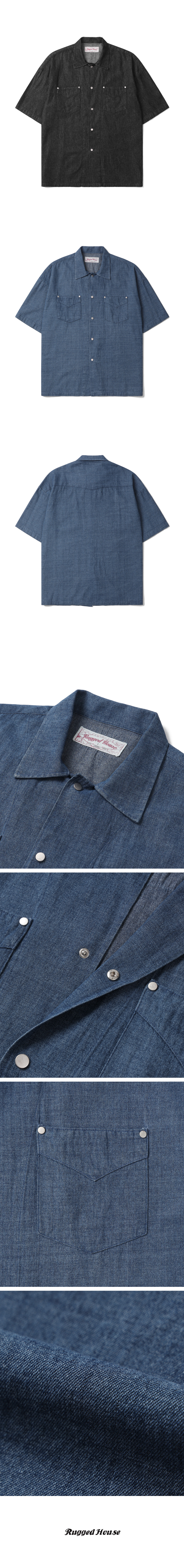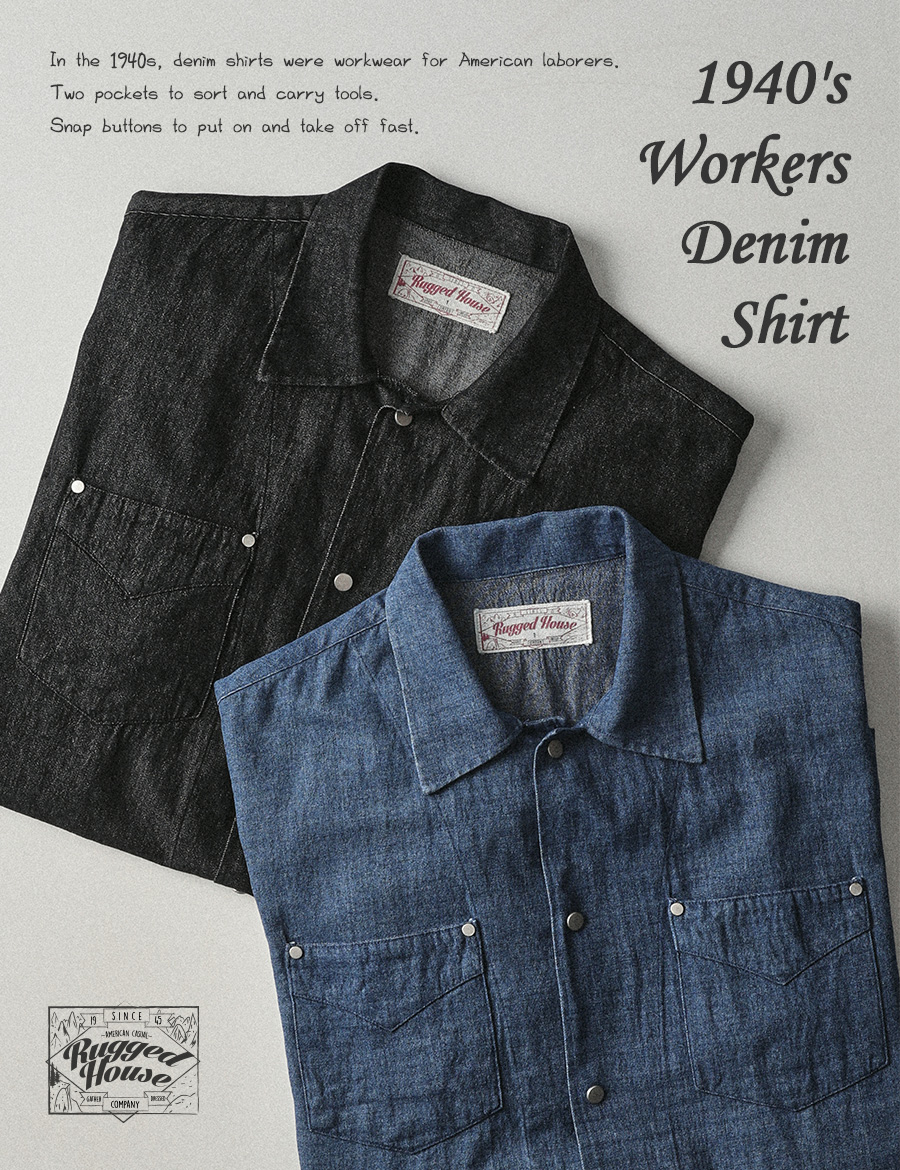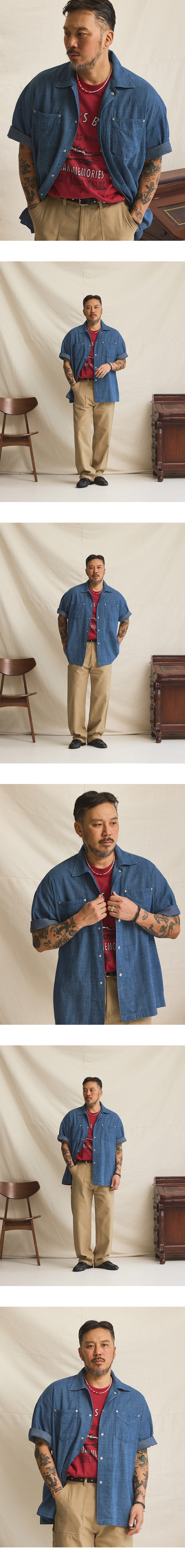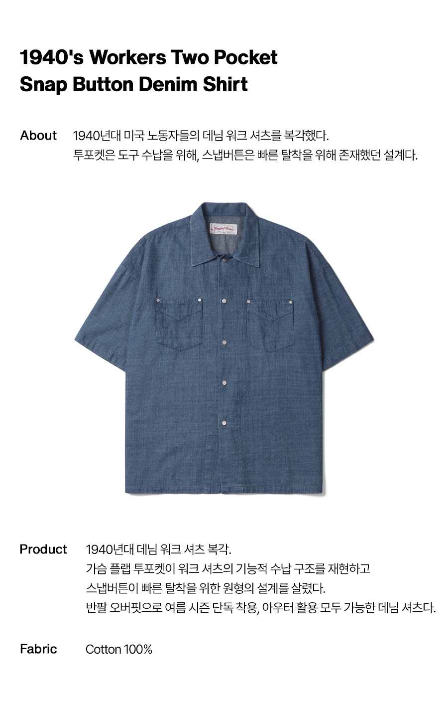 ⦁ 1940년대 미국 노동자들의 데님 워크 셔츠를 현대적으로 복각한 투포켓 워크 데님 반팔.