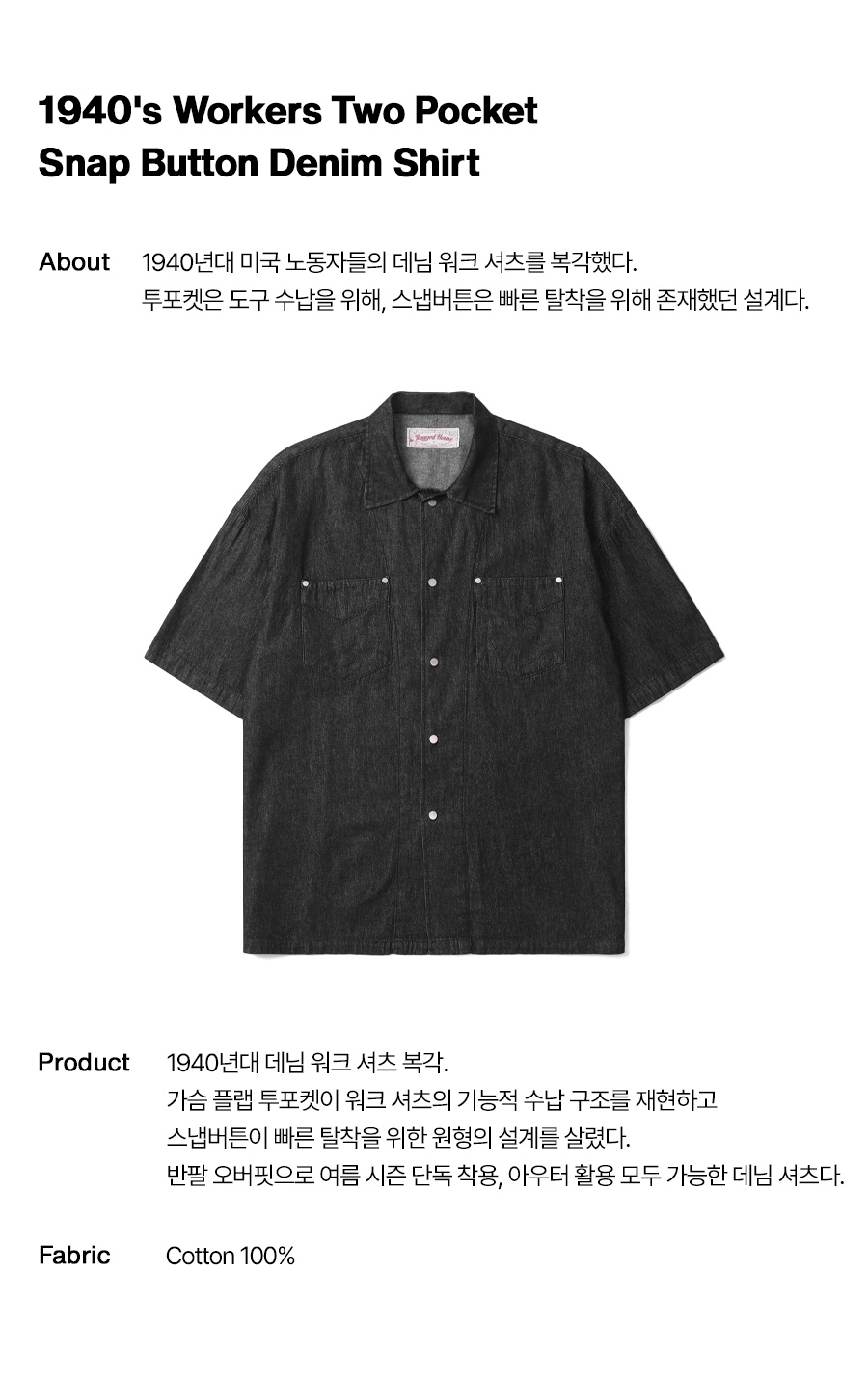 ⦁ 1940년대 미국 노동자들의 데님 워크 셔츠를 현대적으로 복각한 투포켓 워크 데님 반팔.