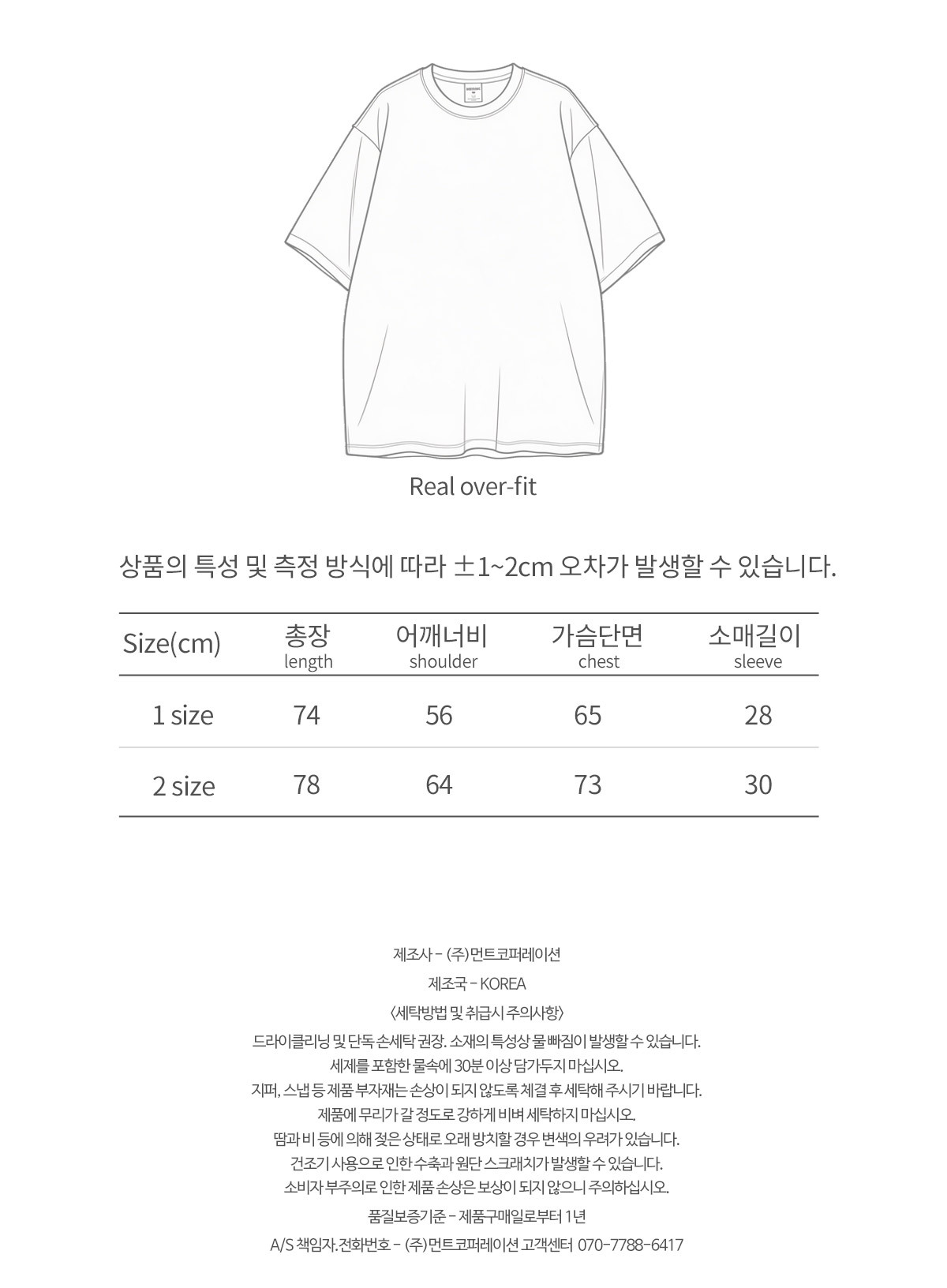 | 소재 | Cotton 100% | A/S 책임자 | (주)먼트코퍼레이션 고객센터 070-7788-6417 |
